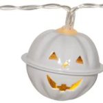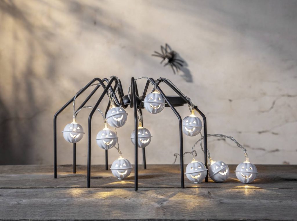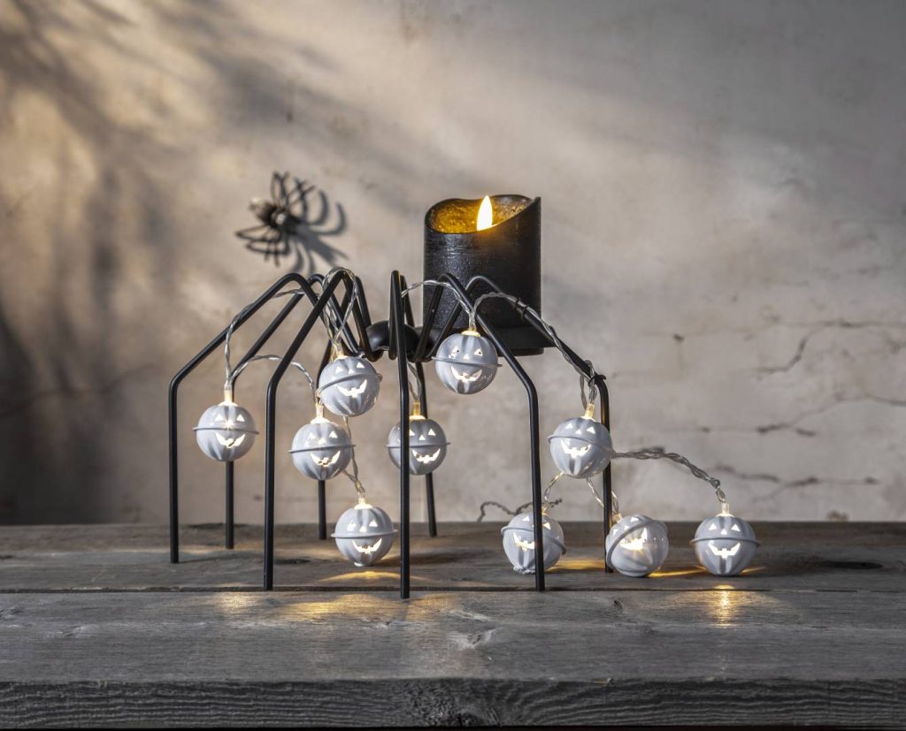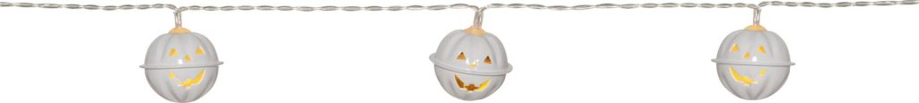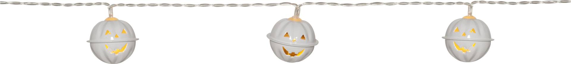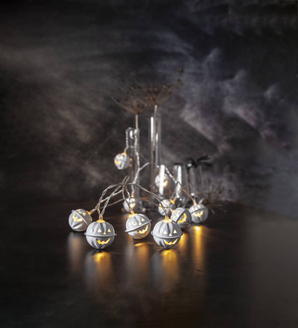 135 cm pitkä valosarja, jossa 10 valkoista metallikurpitsaa lämpimän valkoisilla LED-valoilla. Sopii esimerkiksi syksyn juhliin tai Halloweenin ajan koristeeksi. Sisäkäyttöön.