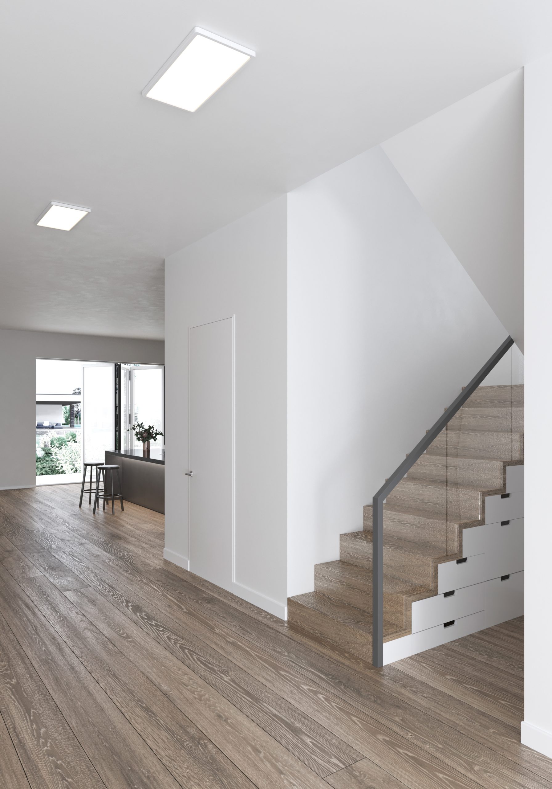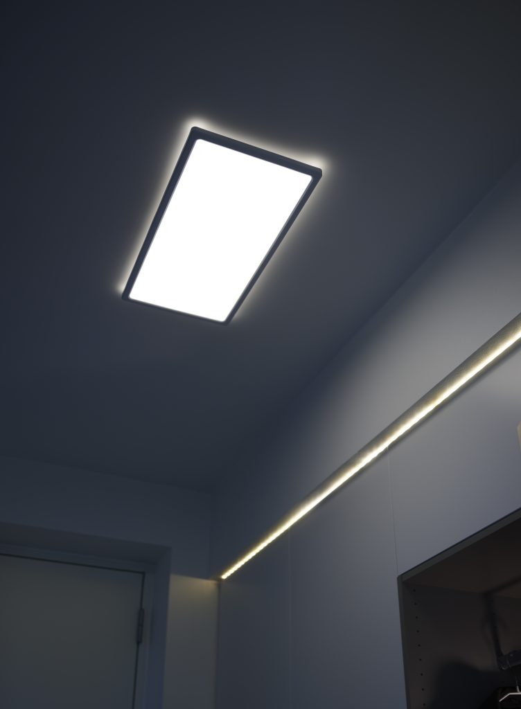 Suorakaiteen muotoinen LED-plafondi muovia. Sopii myös kylpyhuonevalaisimeksi.