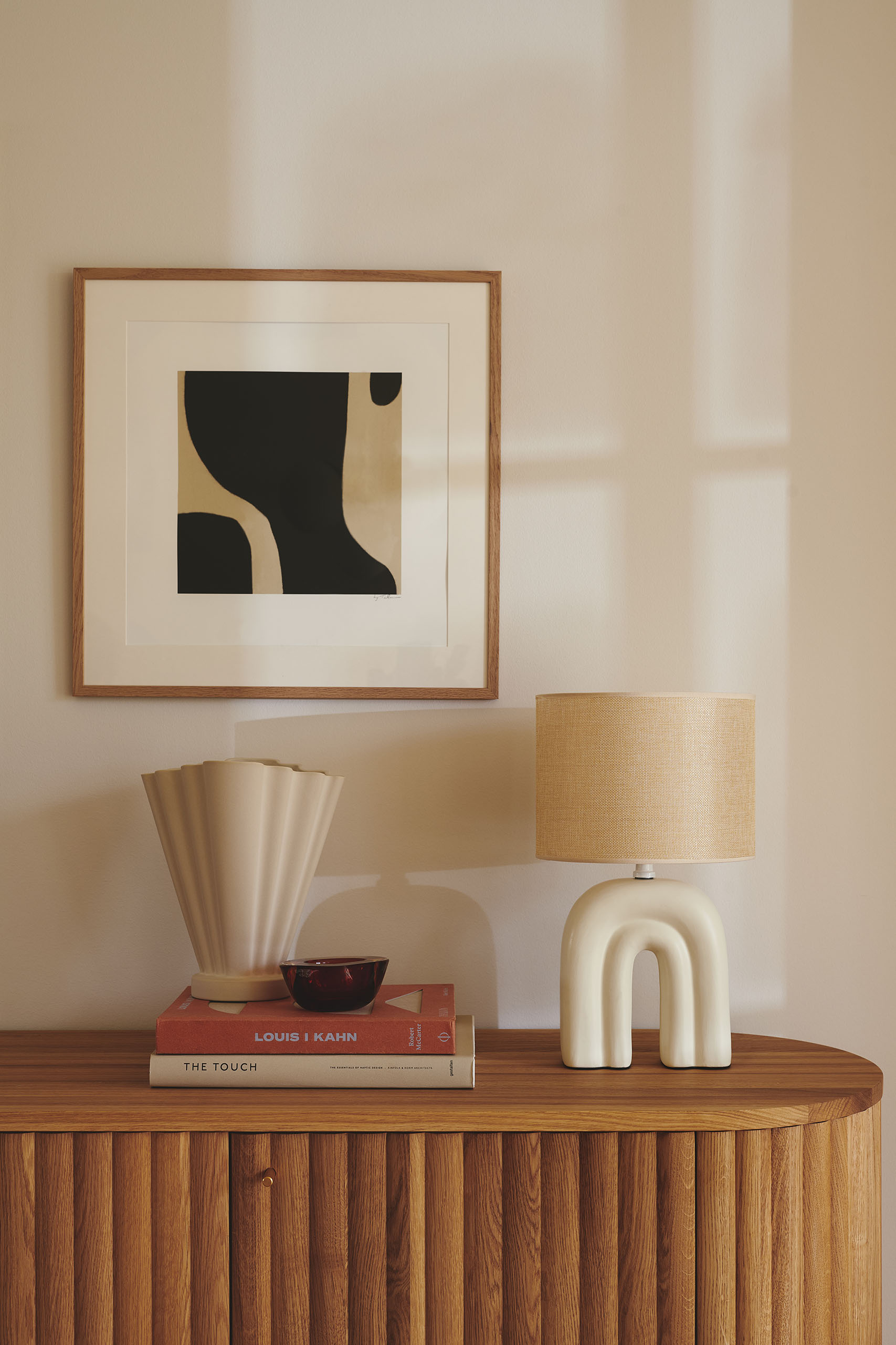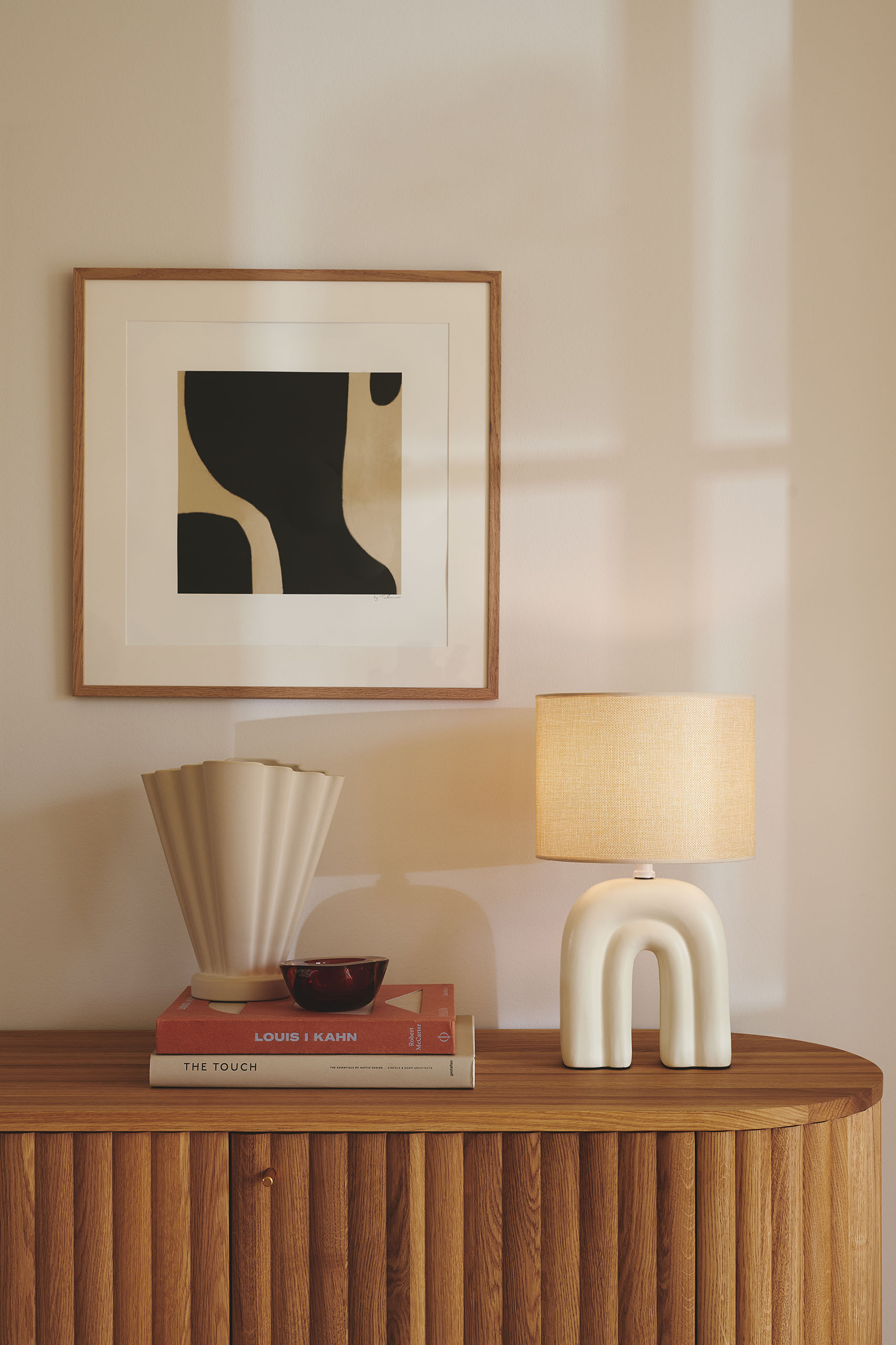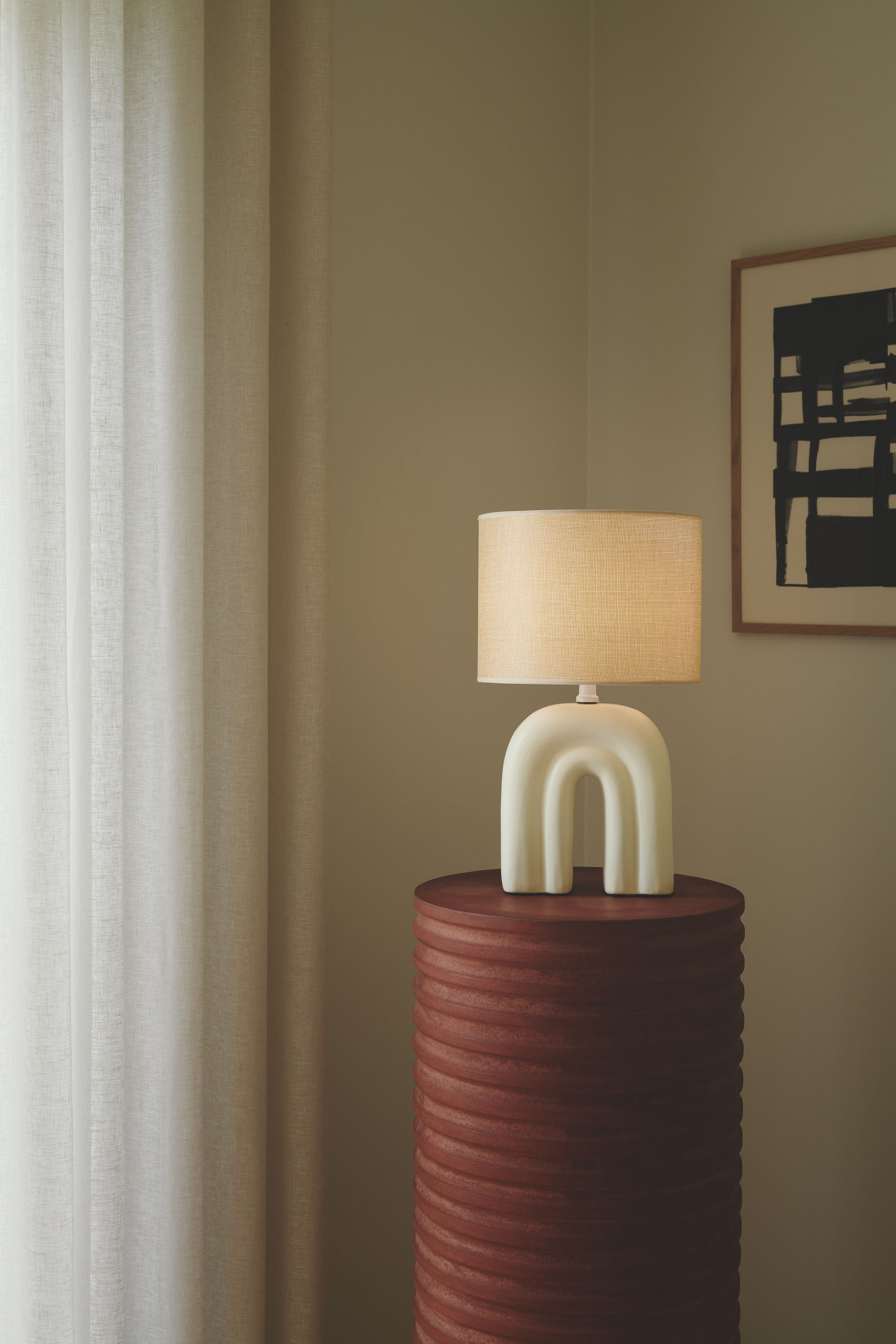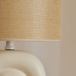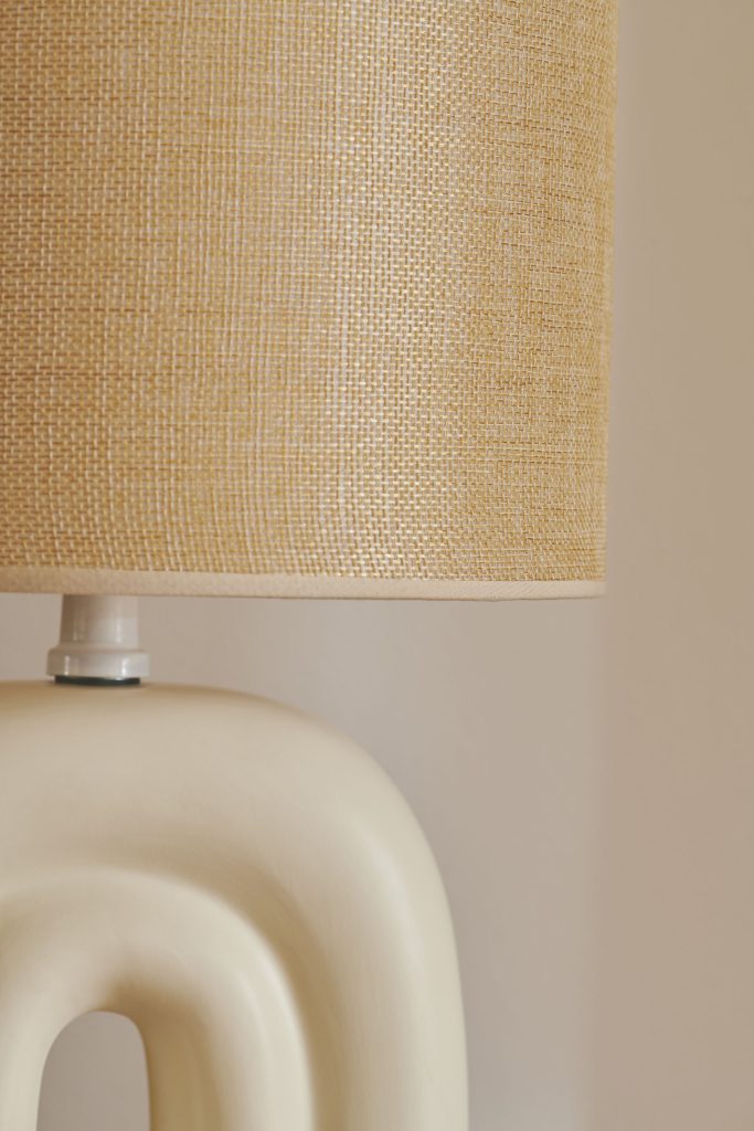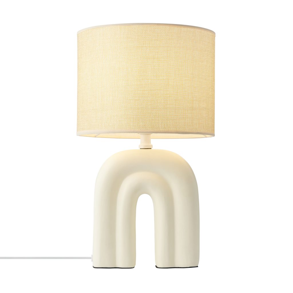 Haze on kauniin muotoinen pöytävalaisin, jonka beigen sävyinen jalka muistuttaa sateenkaarta. Tekstiilivarjostin toimii kauniina kontrastina keraamiselle jalalle, ja luo lämmintä ja pehmeää valoa.