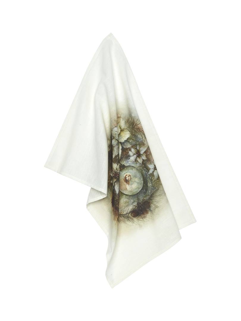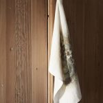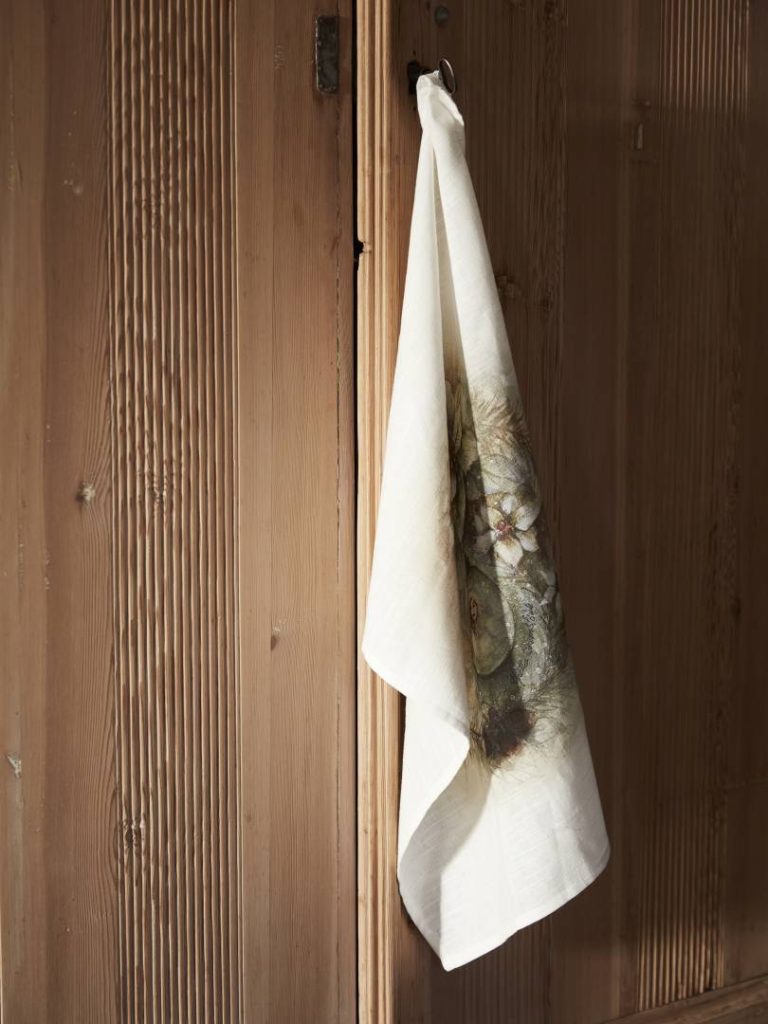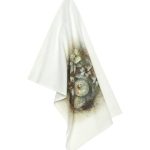 Keittiöpyyhe painetulla kuviolla. Ripustuslenkki pyyhkeen kulmassa.