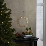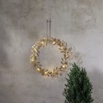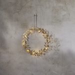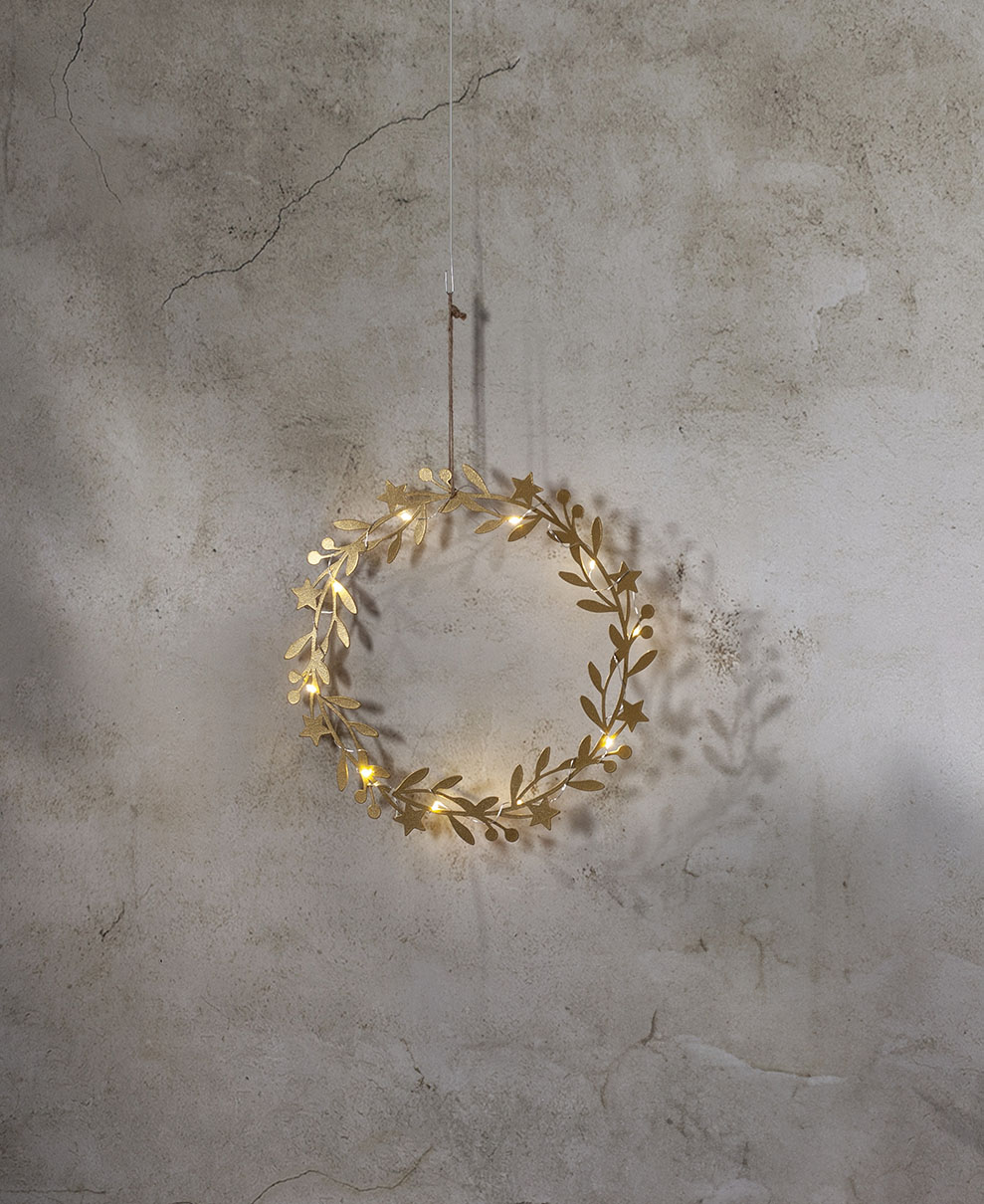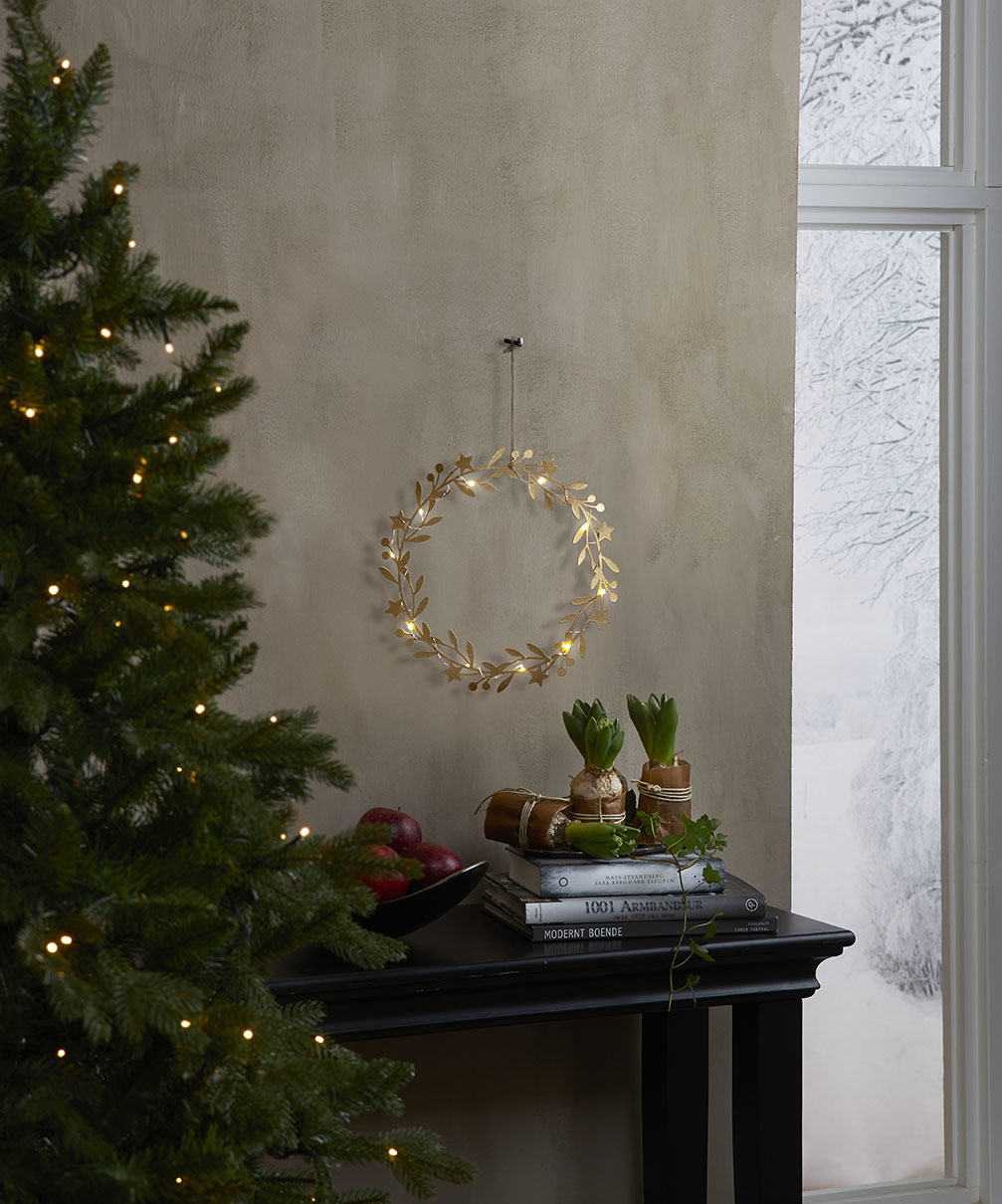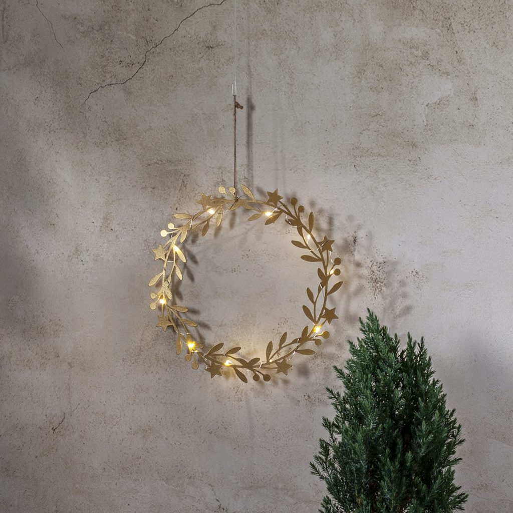 Sievä kullanvärinen metallikranssi sisäkäyttöön. Kranssia valaisevat 10 lämpimän valkoista LED-valopistettä.