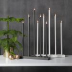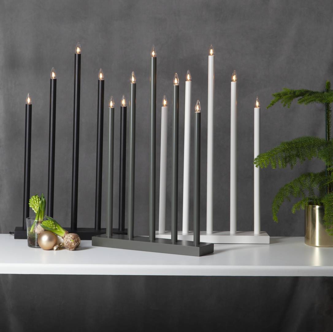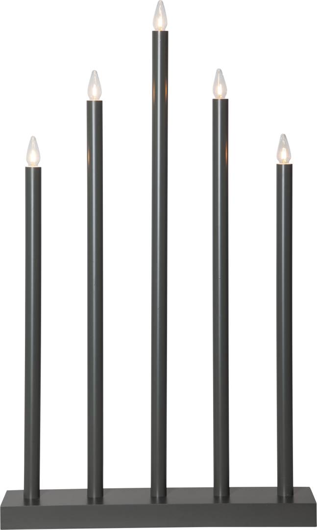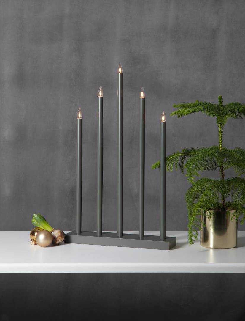 Harmaa 5-haarainen kynttelikkö, jonka jalusta on puuta ja kynttilät metallia. Tyylikäs ja pelkistetty kynttelikkö, joka sopi mainiosti skandinaaviseen sisustustyyliin.