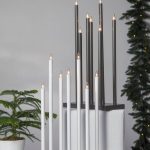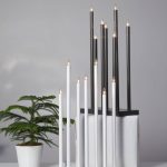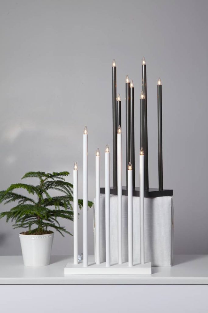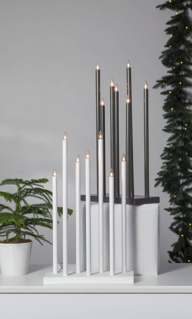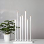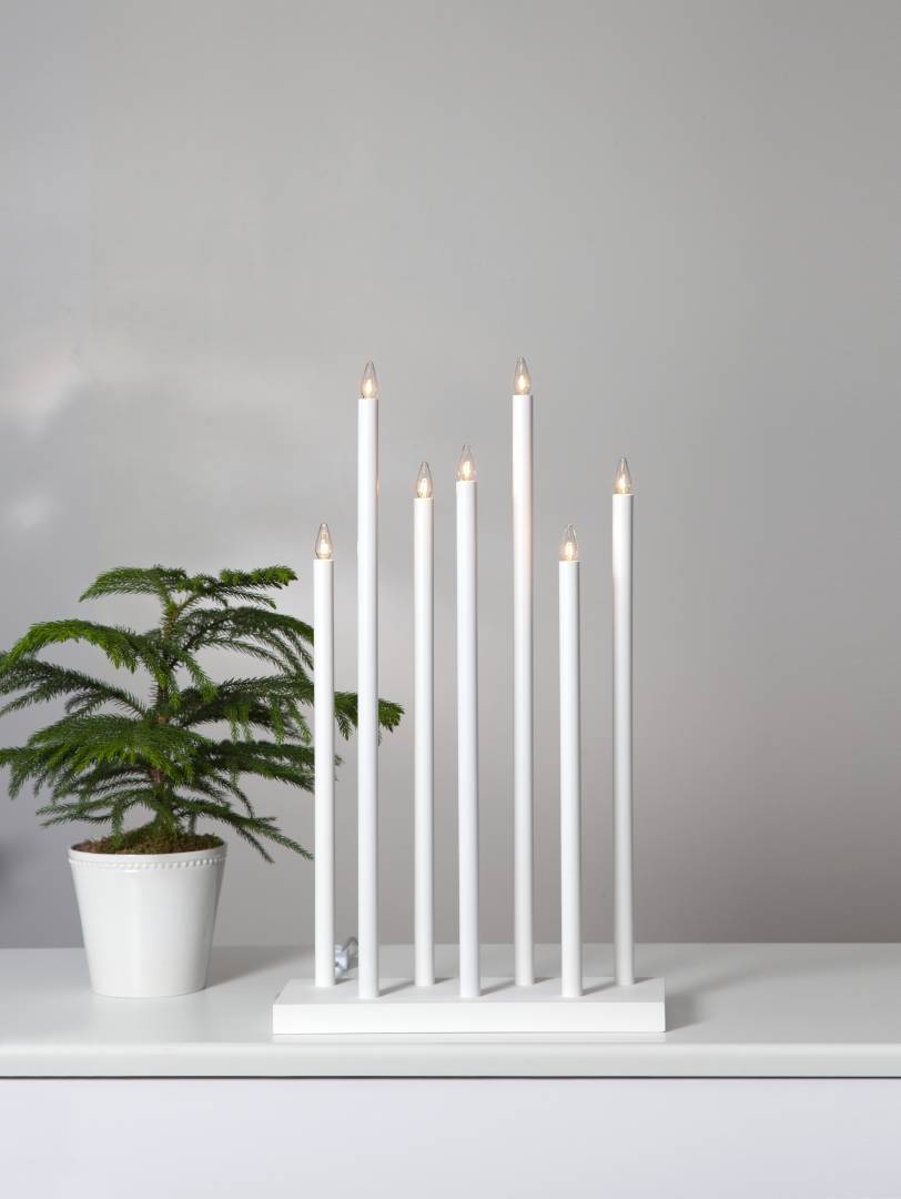 Valkoinen puukynttelikkö metallisilla kynttilöillä. Tyylikäs kynttelikkö, joka tuo kotiisi pohjoismaista sisustustyyliä.