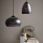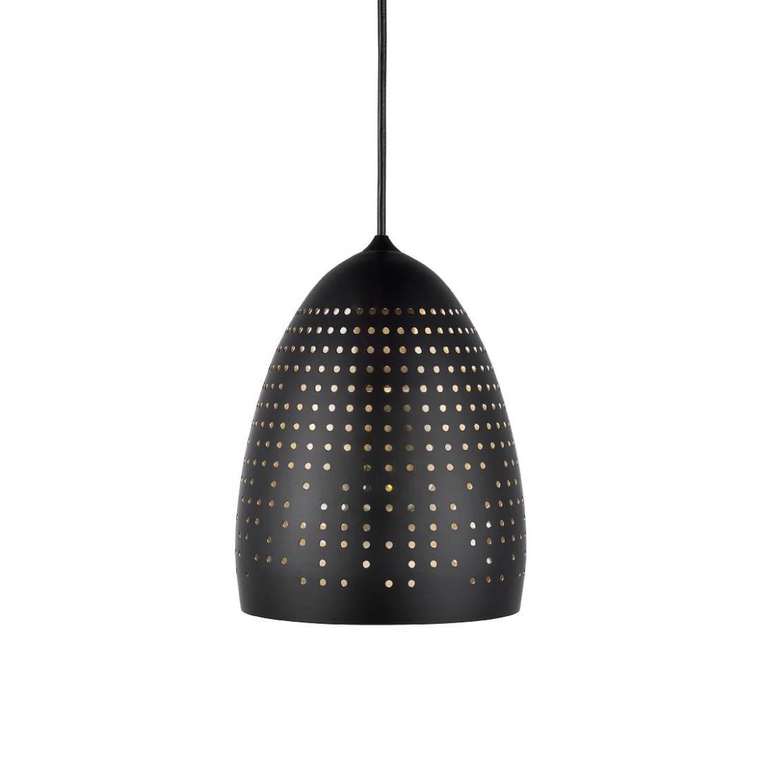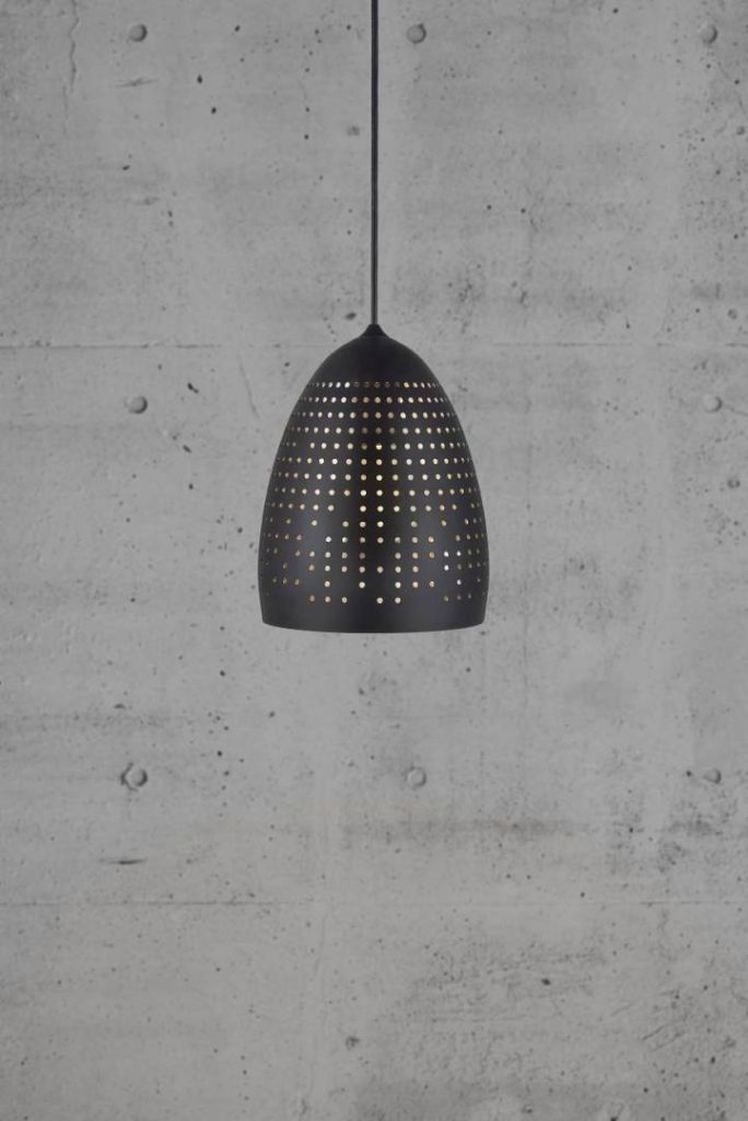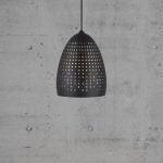 Musta metallinen kattovalaisin. Valo heijastuu kauniisti valaisimen