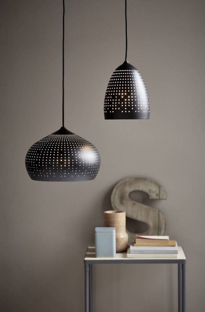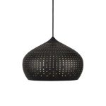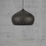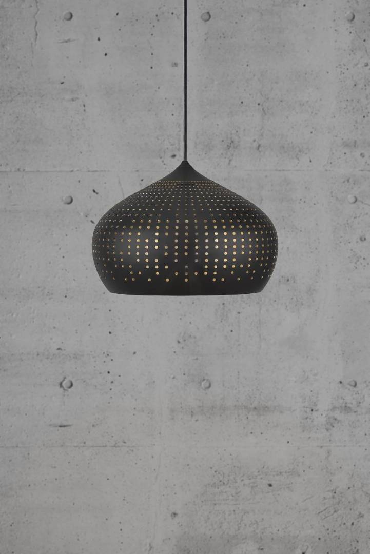Musta metallinen kattovalaisin. Valo heijastuu kauniisti valaisimen