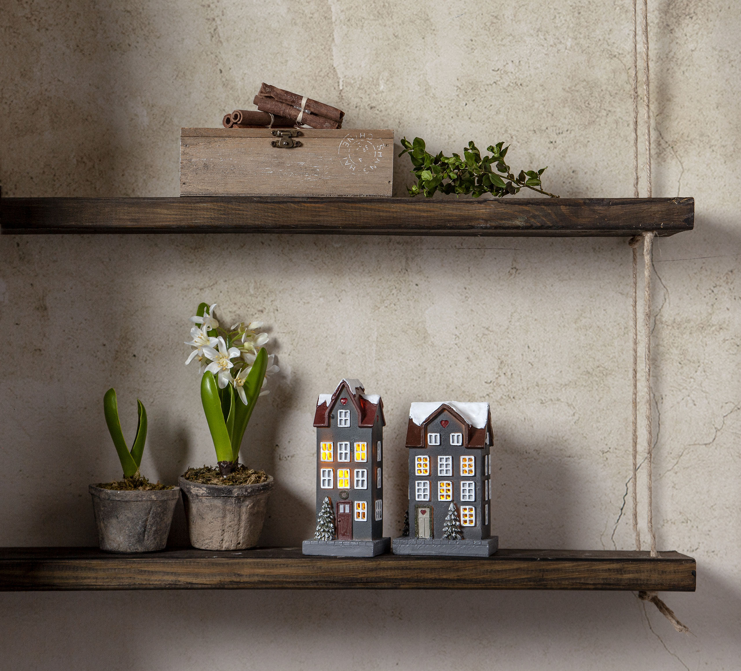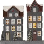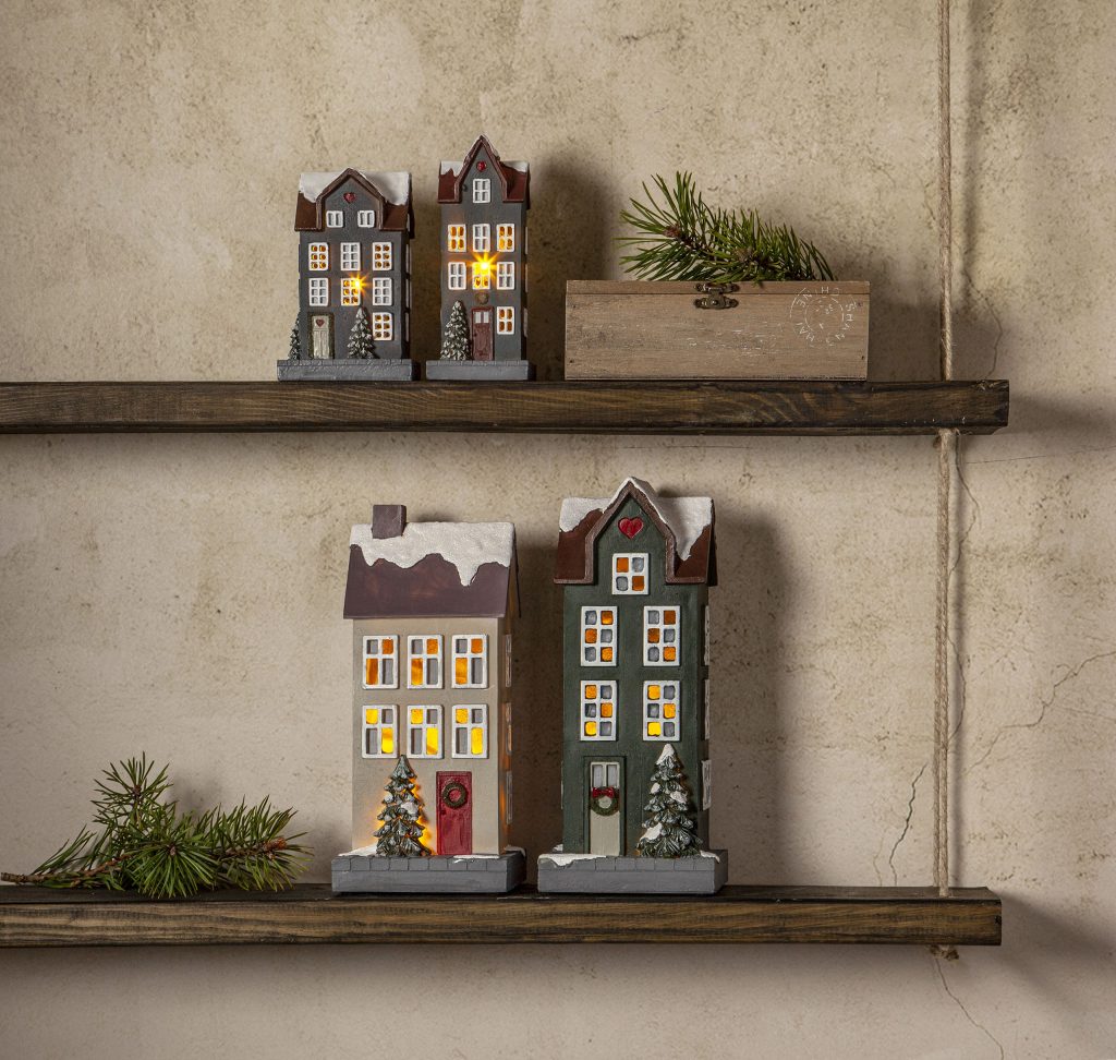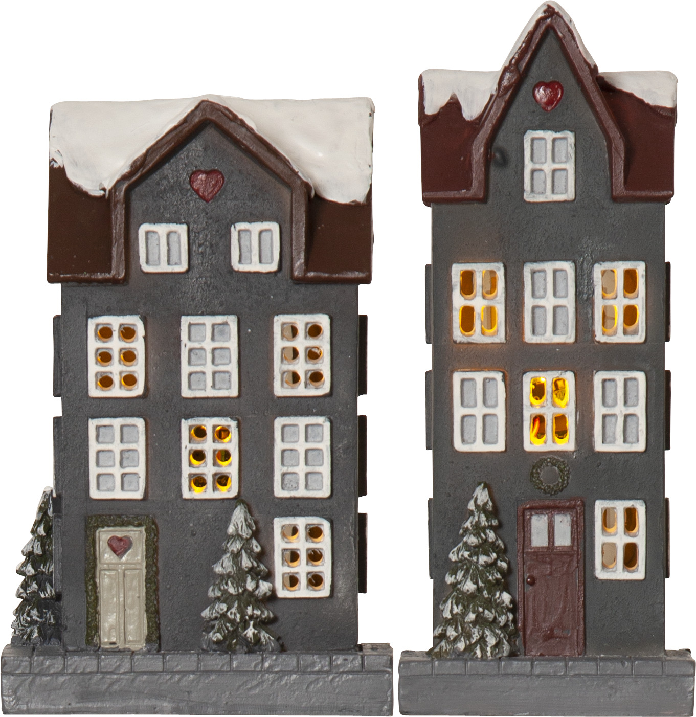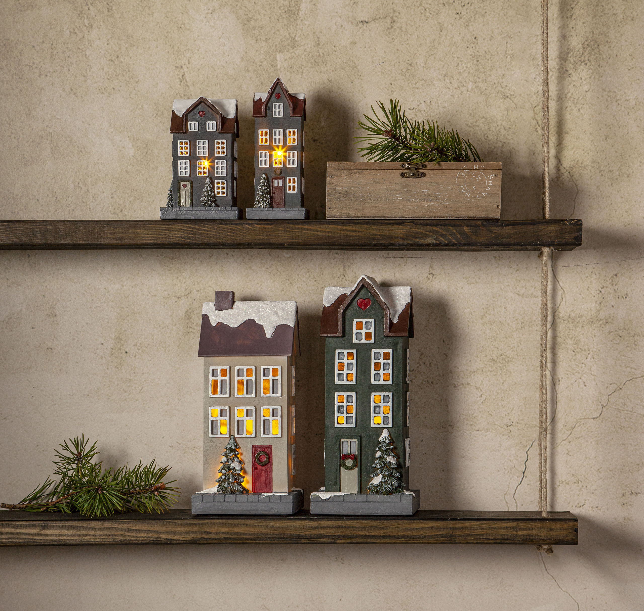 Pöytäkoristesetti, jossa on kaksi kaunista taloa. Kumpaakin taloa valaisee lämpimän valkoinen LED-valo. Sopii esimerkiksi lipaston päälle tai hyllylle tunnelmalliseksi koristevaloksi pimeään vuodenaikaan.