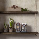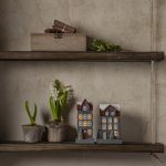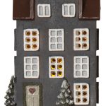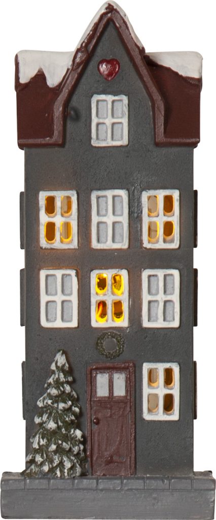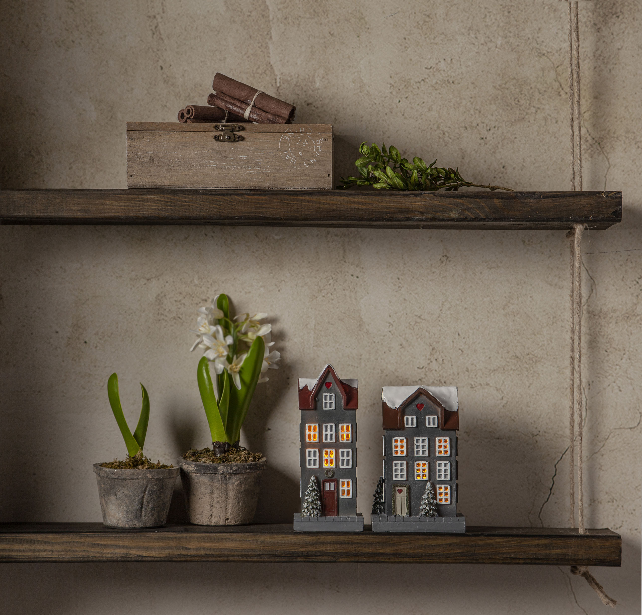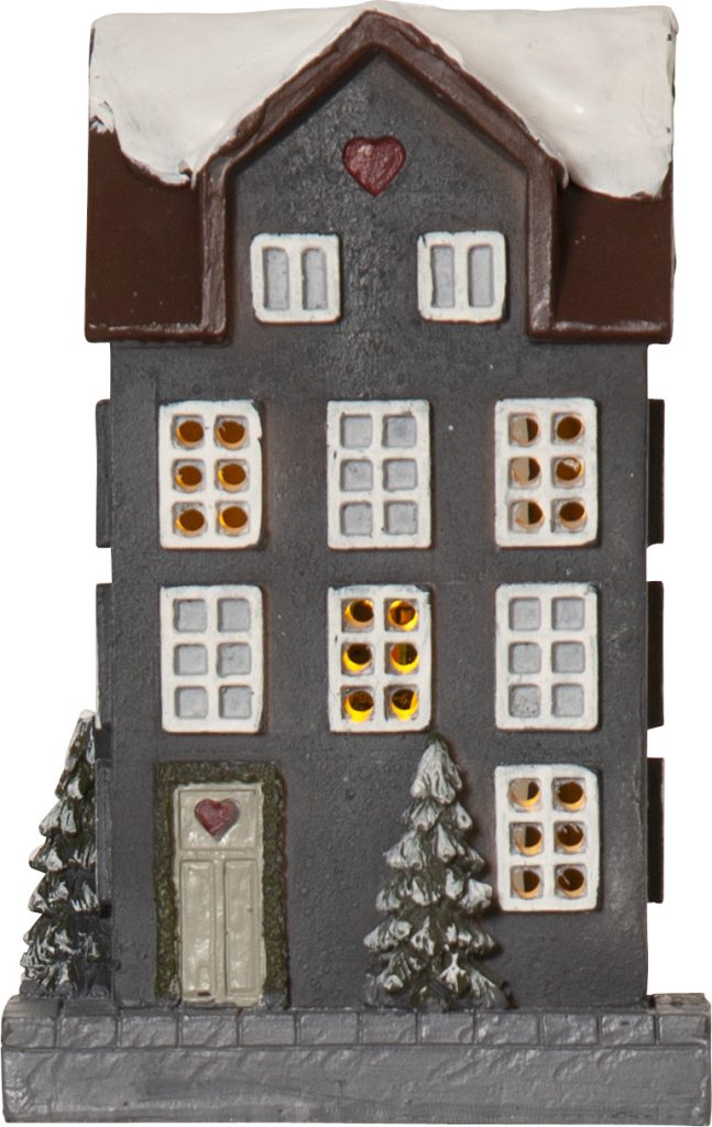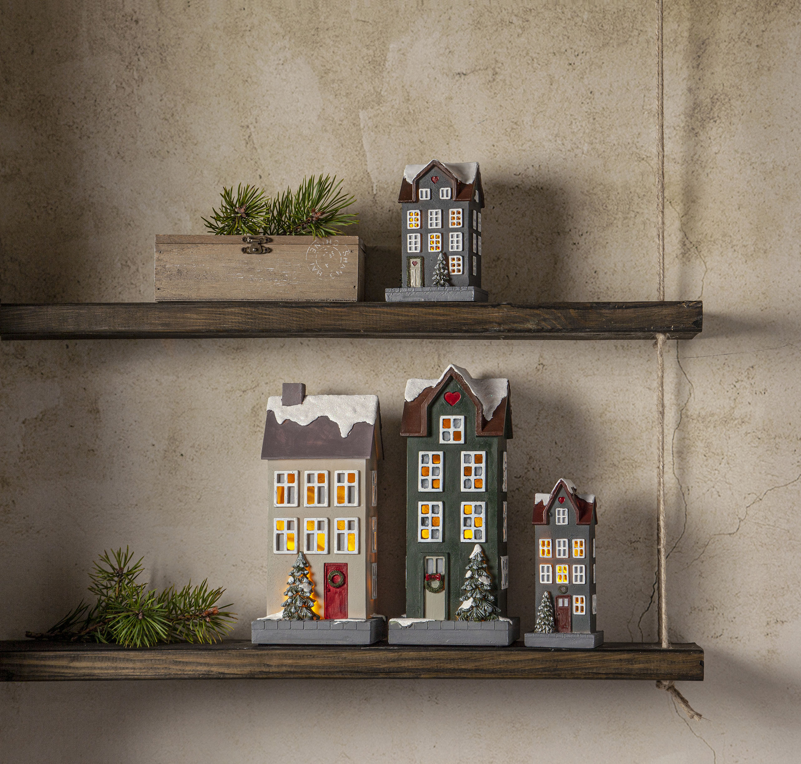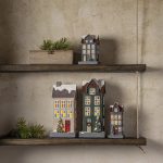 Pöytäkoristesetti, jossa on kaksi kaunista taloa. Kumpaakin taloa valaisee lämpimän valkoinen LED-valo. Sopii esimerkiksi lipaston päälle tai hyllylle tunnelmalliseksi koristevaloksi pimeään vuodenaikaan.
