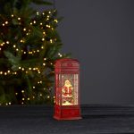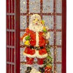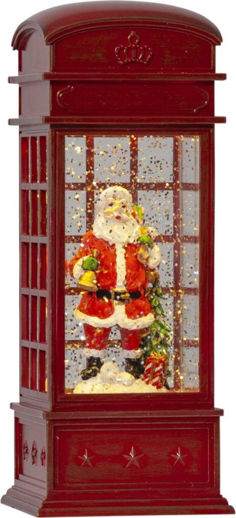 Sisäkäyttöön sopiva koriste, joulupukki puhelinkopissa.