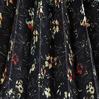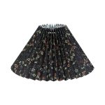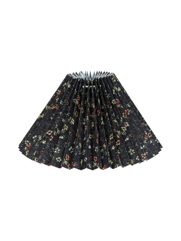 Vekkivarjostin, jossa tummalla pohjalla pieniä kukkia. Sisäpinta on valkoinen.