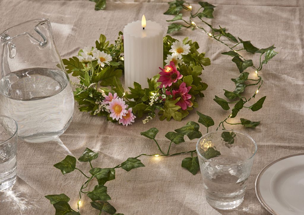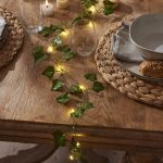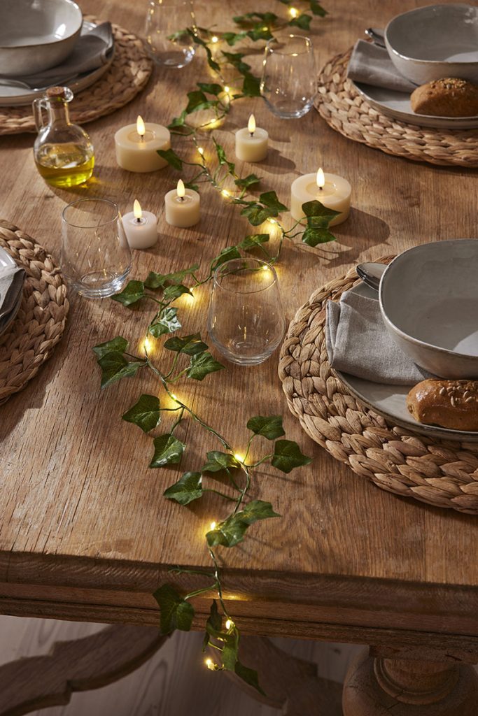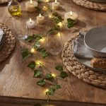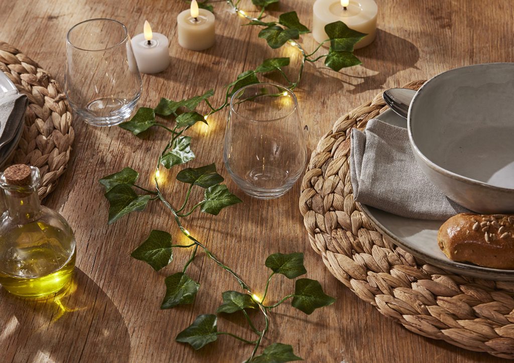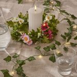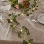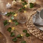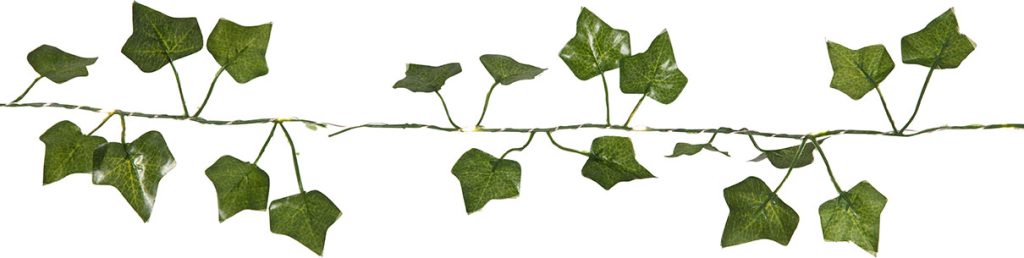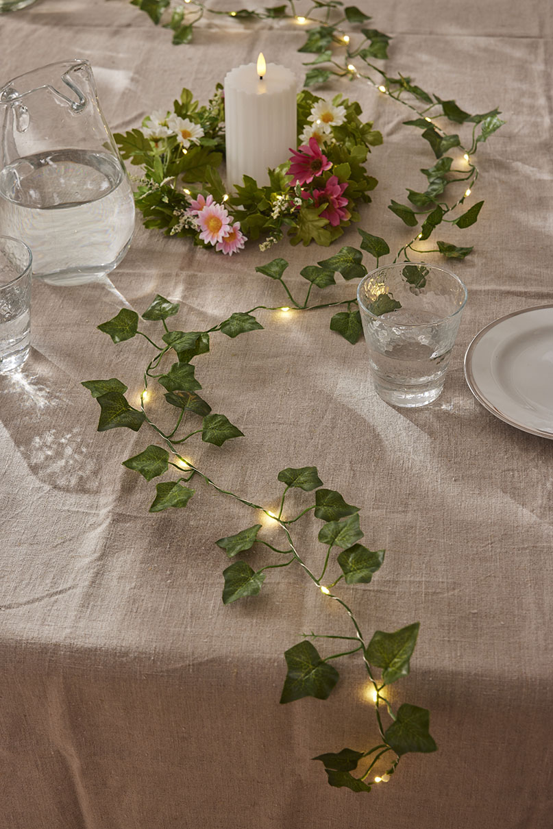 Paristokäyttöinen 200 cm pitkä koristevalosarja, jossa on vihreitä muratinlehtiä ja 20 lämpimän valkoista LED-valoa. Sopii esimerkiksi pöytäkattauksiin. Sisäkäyttöön.
