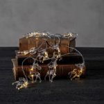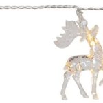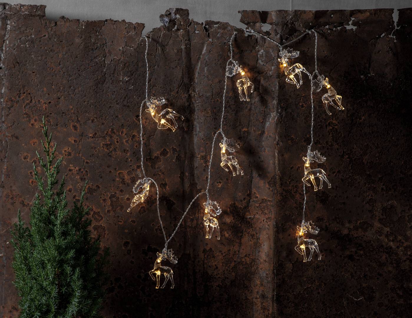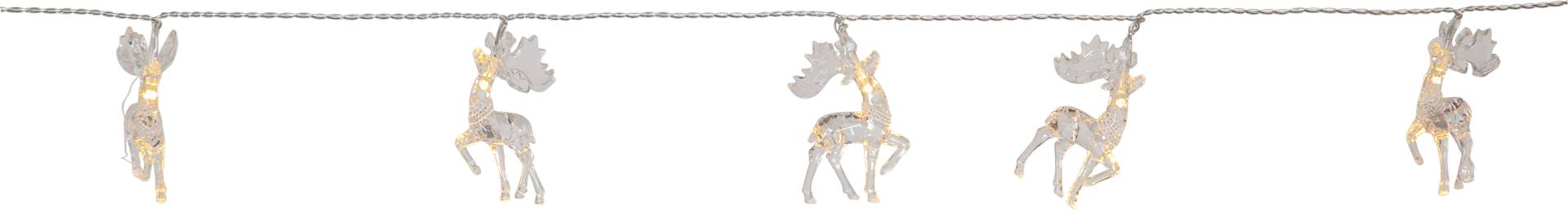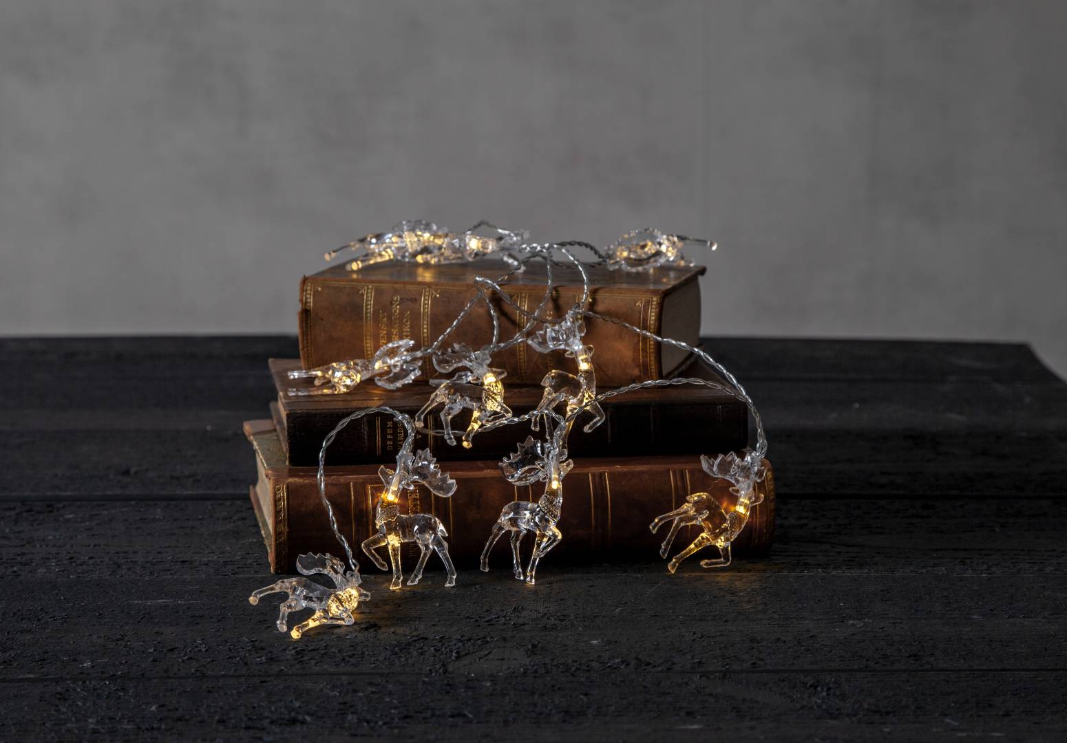 Paristokäyttöinen valosarja, jossa on läpinäkyvät porokoristeet ja 10 lämpimän valkoista LED-valoa. Sopii esimerkiksi joulukuuseen tai pöytäkoristeeksi.