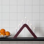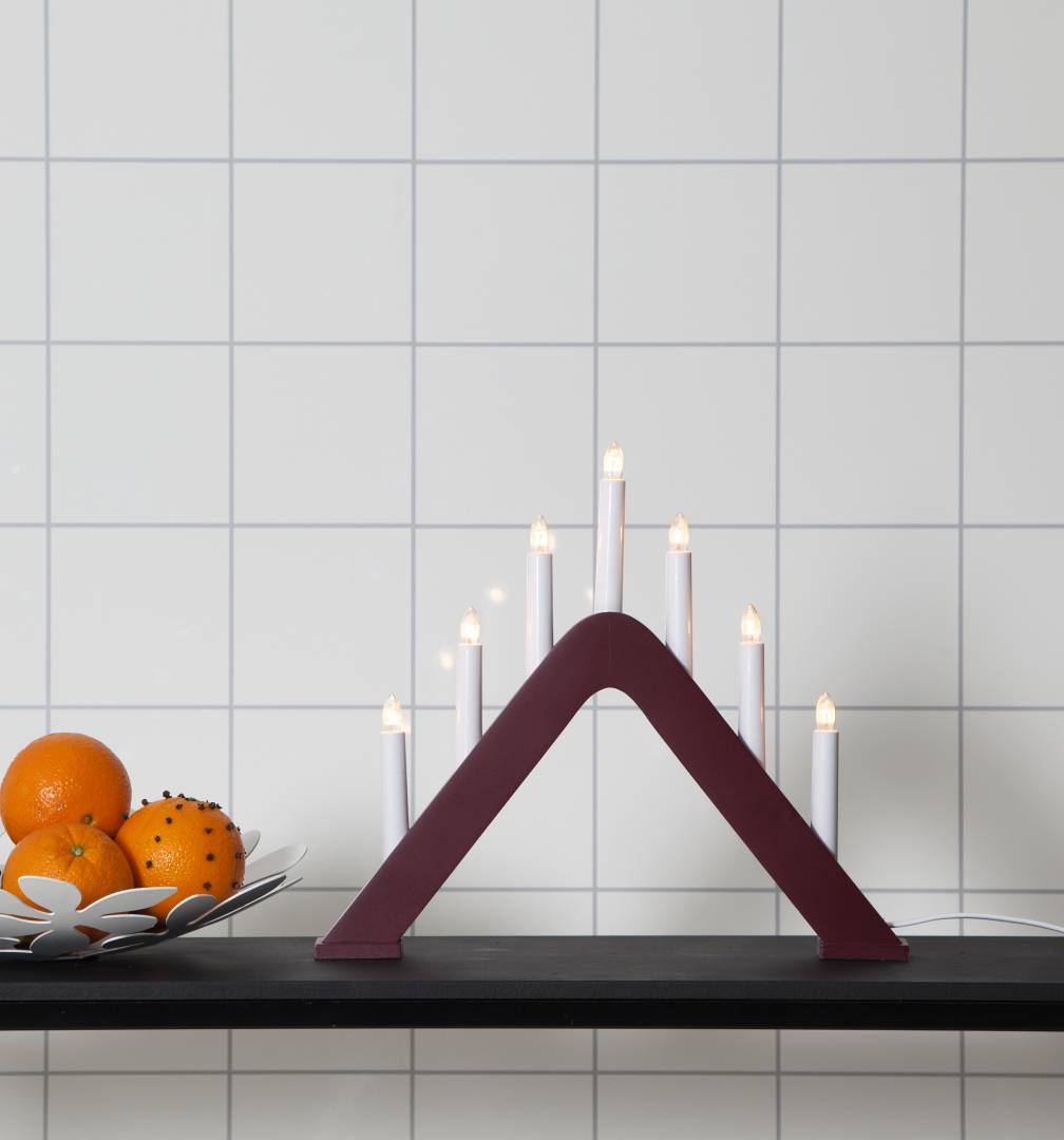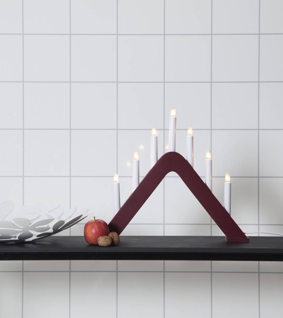 Punainen pelkistetty puukynttelikkö, joka sopii esim. ikkunalaudalle tai lipaston päälle luomaan kotiin jouluista tunnelmavalaistusta.