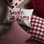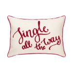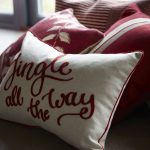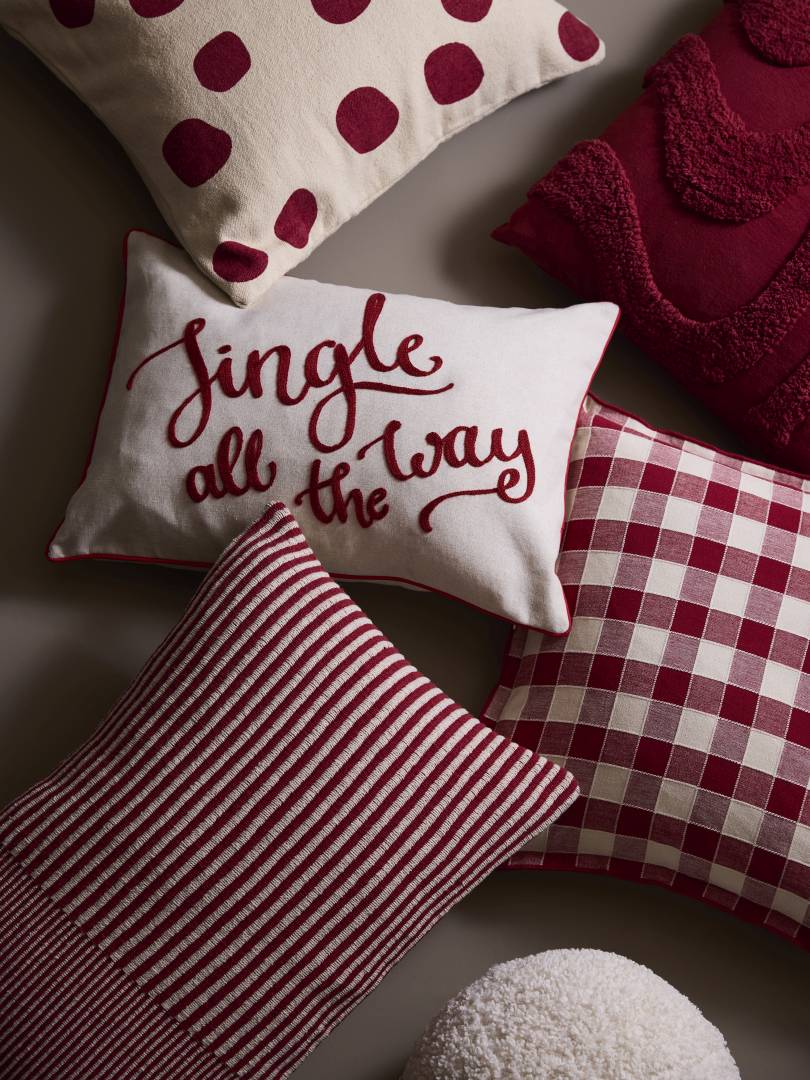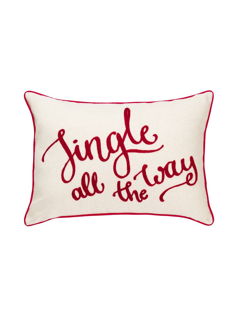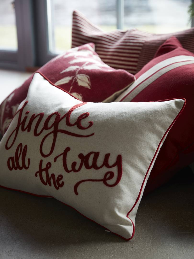 Tyynynpäällinen, jossa jouluinen teksti ja reunusnauha tyynyn ympärillä. Vetoketju alareunassa.
