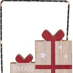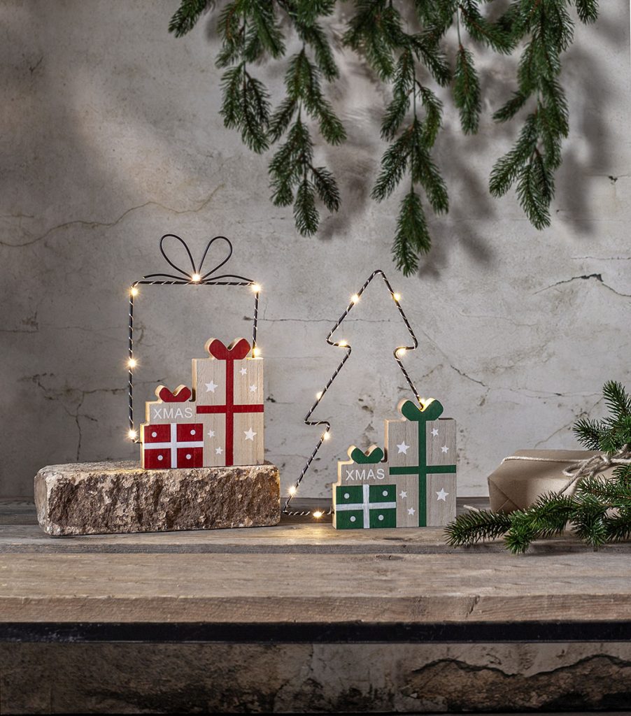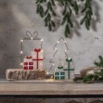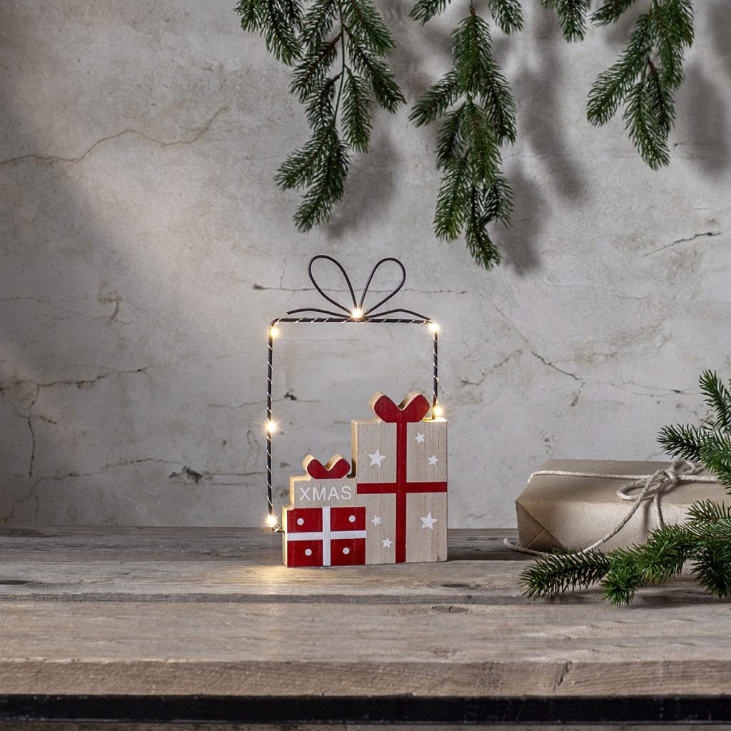 Paristokäyttöinen pöytäkoriste, jossa paketti-siluettia koristavat värikkäät puiset paketit. Sopii esimerkiksi ikkunalaudalle tai lipaston päälle. Metallikehikon ympärillä valaisee 6 pientä LED-valopistettä lämpimän valkoisella valolla.