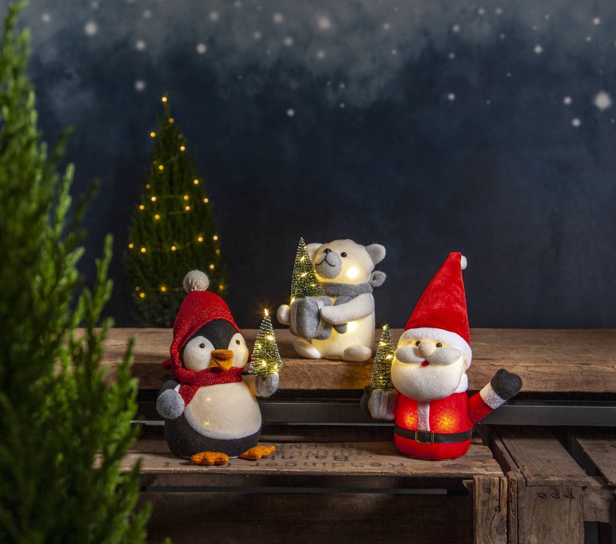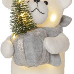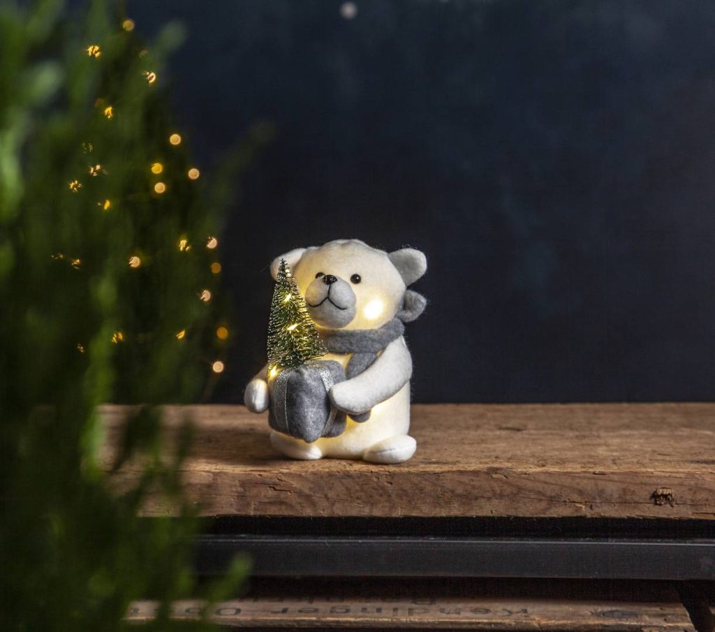 Suloinen jääkarhuhahmo LED-valoilla. Valot loistavat lämpimän valkoisina niin pingviinin vartalossa kuin kuusessa. Sisäkäyttöön.