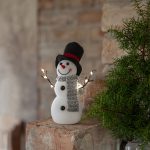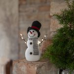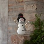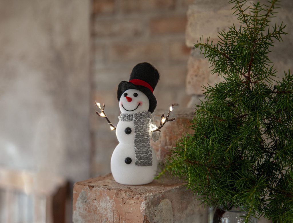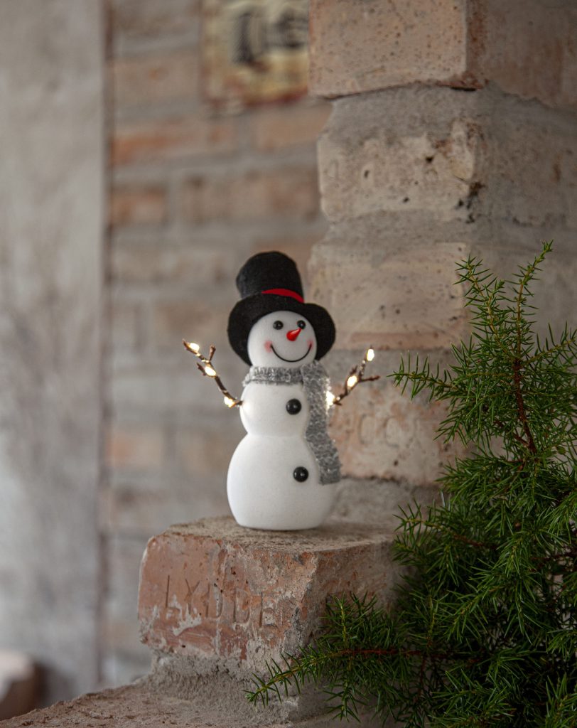 Suloinen pieni lumiukko-hahmo tuo lämmintä jouluista tunnelmaa. Lumiukon käsissä loistaa 6 lämpimän valkoista pientä LED-valopistettä.
