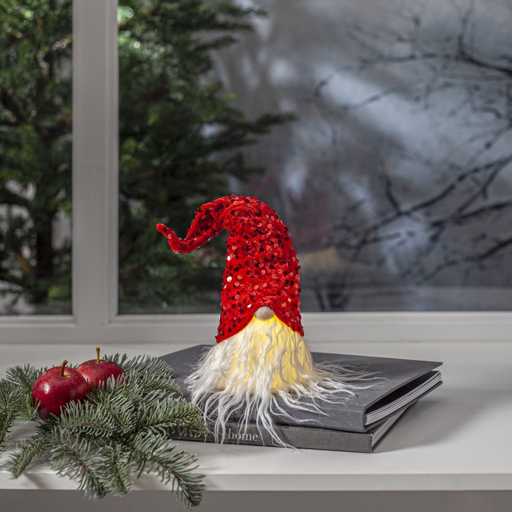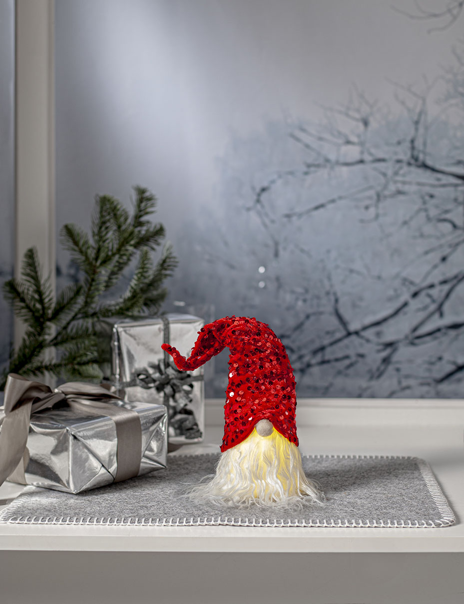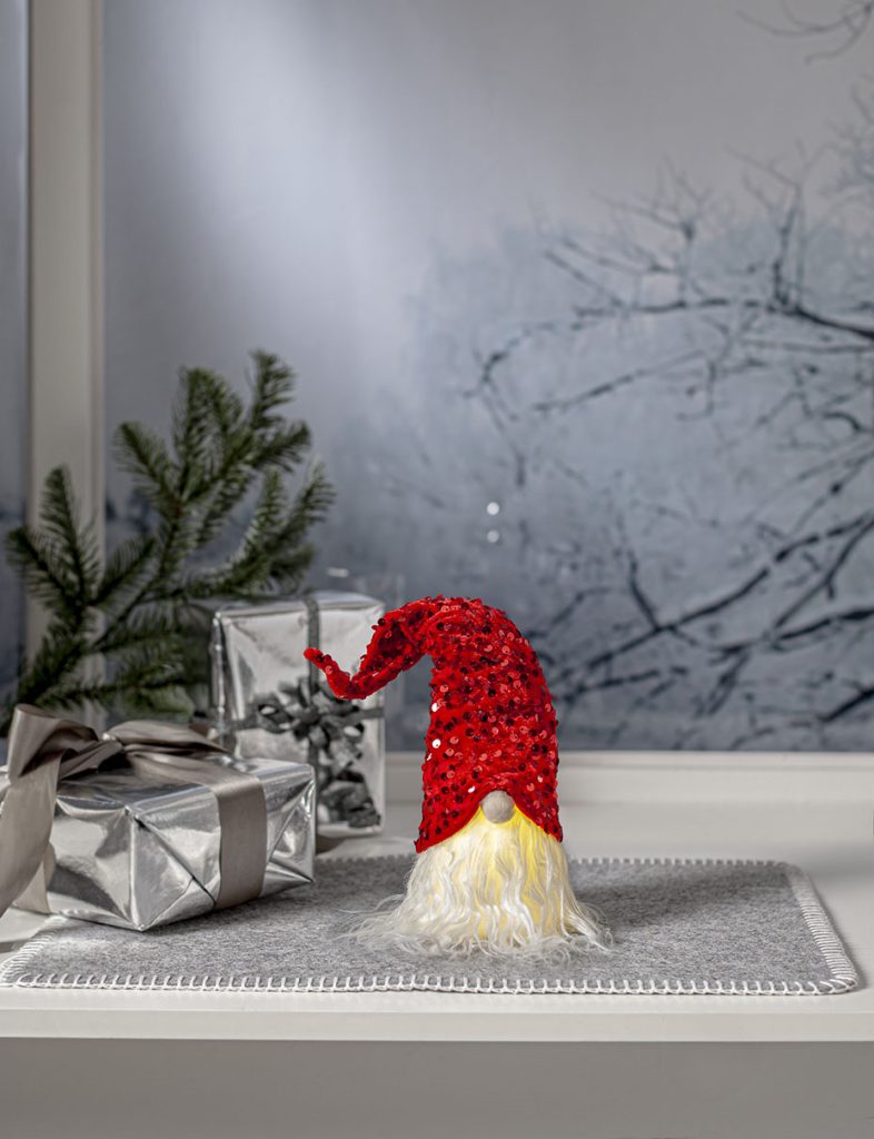 Paristoilla toimiva paljettimyssyinen tonttu sisäkäyttöön. Hauska koriste, joka on helppo sijoittaa sopivaan paikkaan luomaan kotiin jouluista tunnelmaa. Tonttua valaisee lämpimän valkoinen LED-valo.