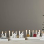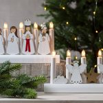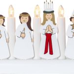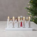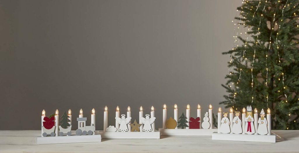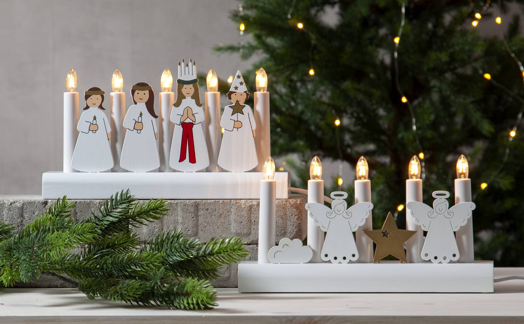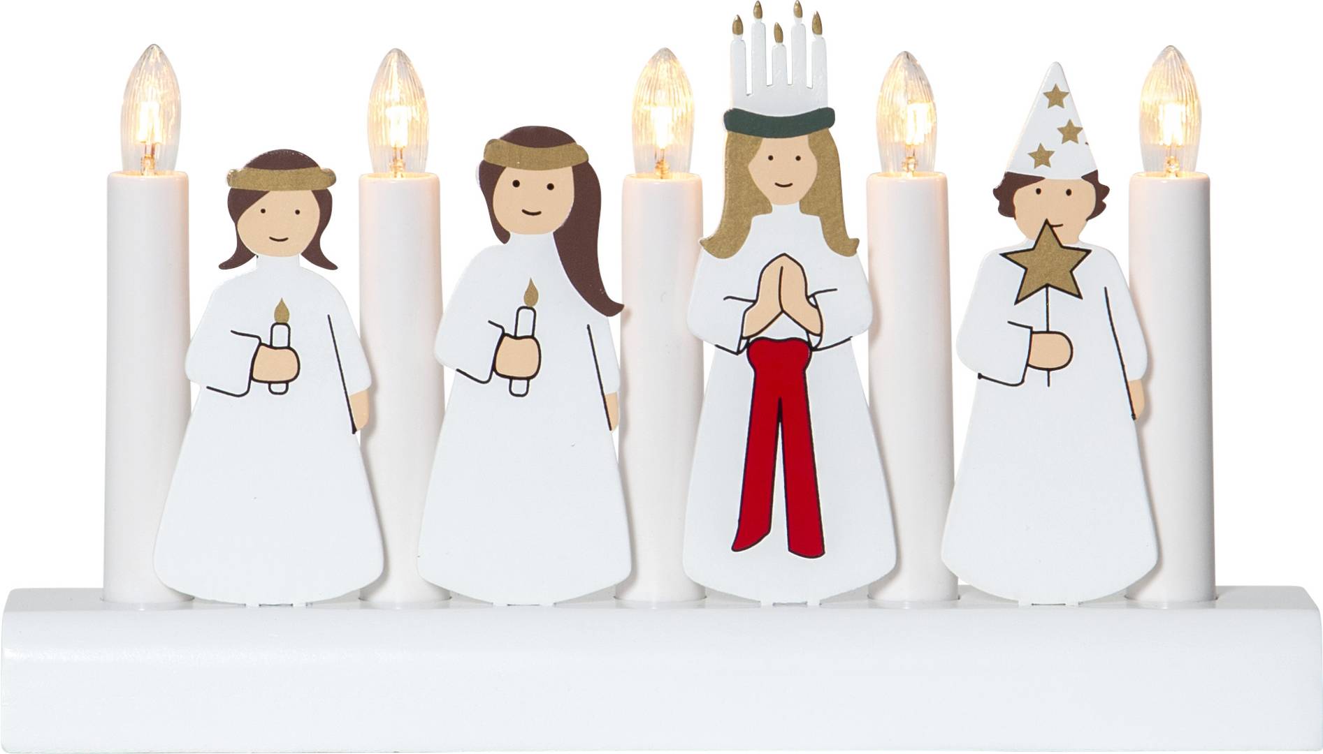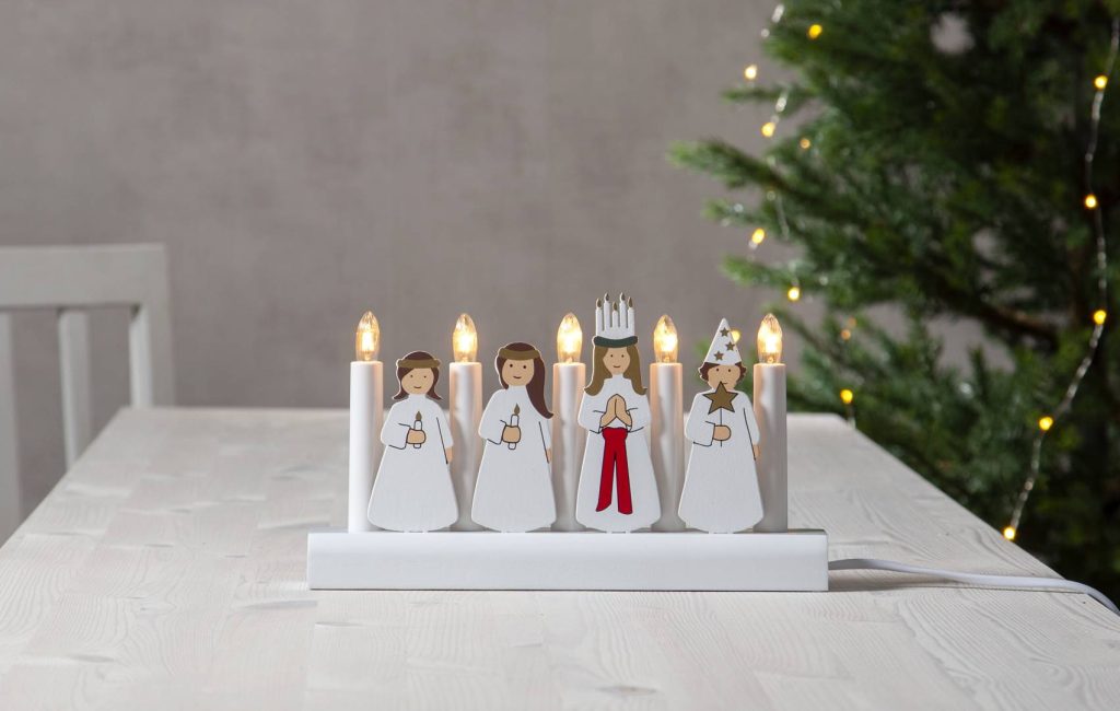 Lucia-figuureilla koristettu puukynttelikkö, joka sopii esimerkiksi ikkunalaudalle tai lipaston päälle tuomaan kotiisi jouluista tunnelmaa.