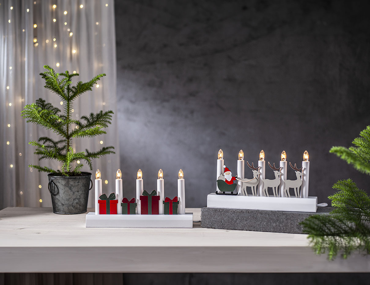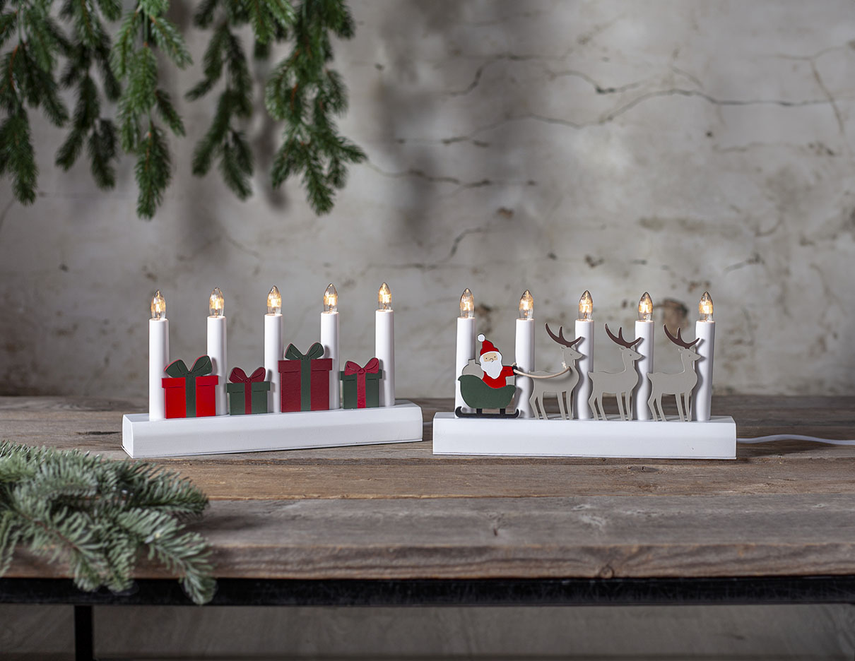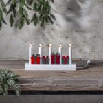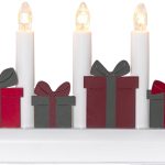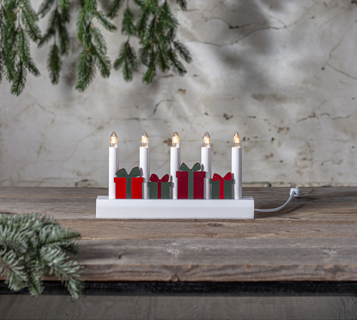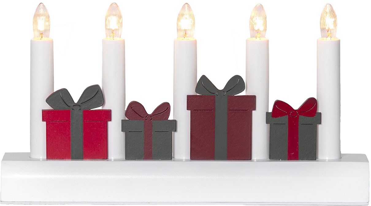 Kynttelikkö, jonka koristuksena on jouluisin värein maalatut lahjapaketit. Sopii esimerkiksi ikkunalaudalle luomaan joulutunnelmaa.