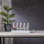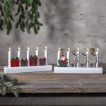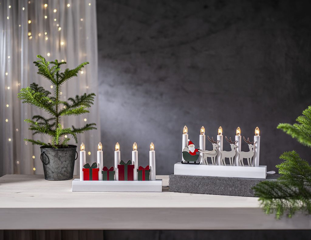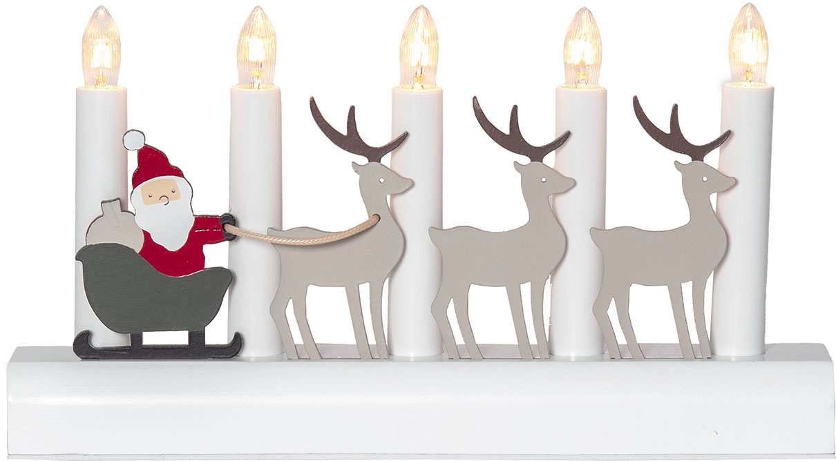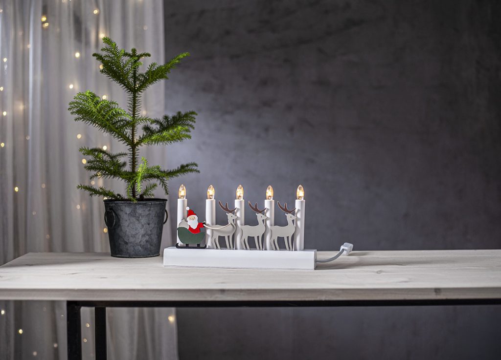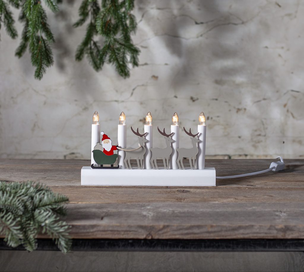 Kynttelikkö, jonka koristuksena on jouluisin värein maalatut pukki ja porot. Sopii esimerkiksi ikkunalaudalle luomaan joulutunnelmaa.