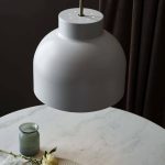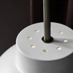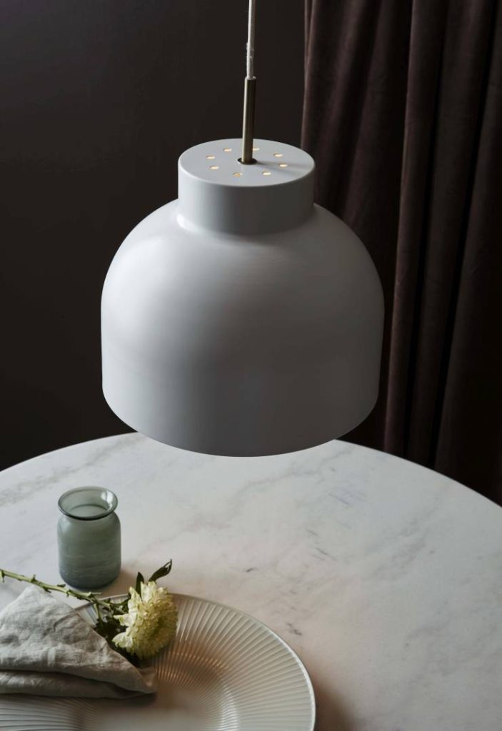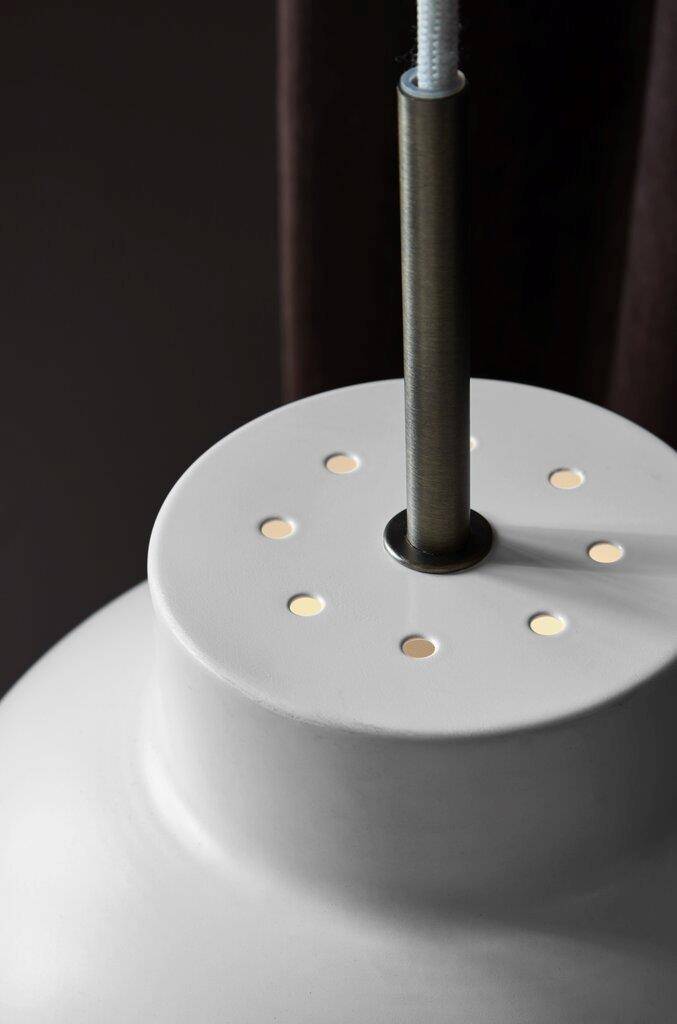 Riippuvalaisin valkoista metallia. Varjostimen yläosassa pieniä reikiä, joista valo loistaa myös ylöspäin.