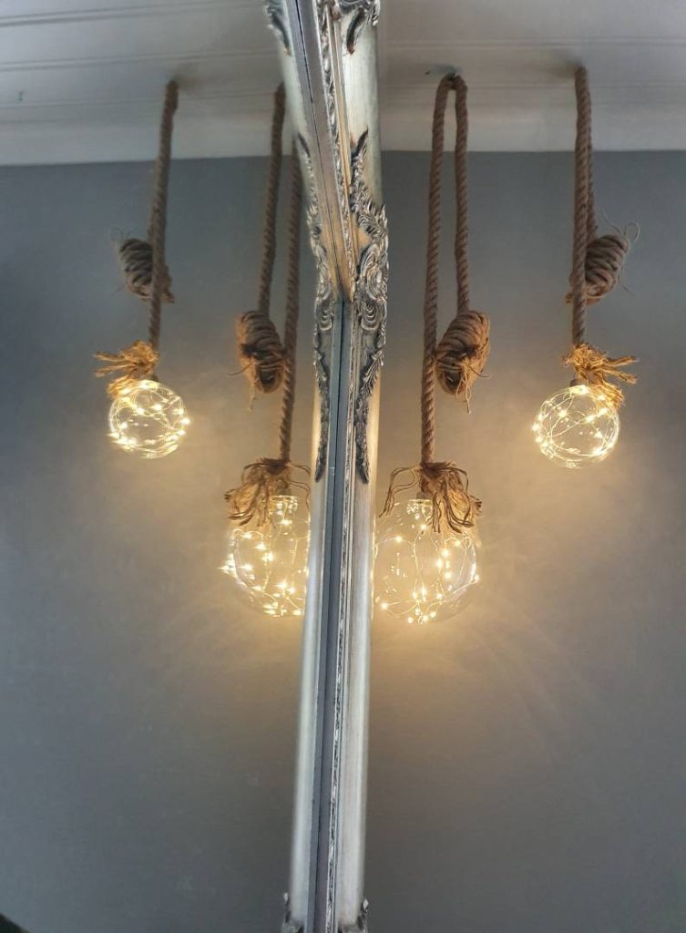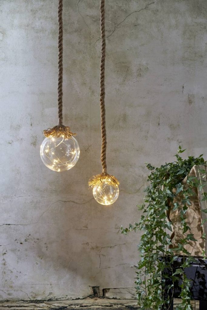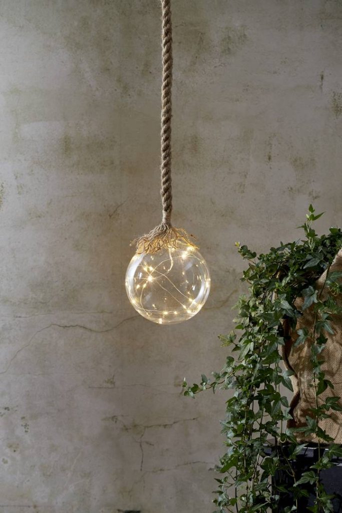 Lasipallo, jonka sisällä 15 lämpimän valkoista Dew Drop LED-valoa ja koristeena juuttiköysi. Paristoilla toimiva sisäkäyttöön soveltuva koriste, joka loistaa tunnelmallista valoa.