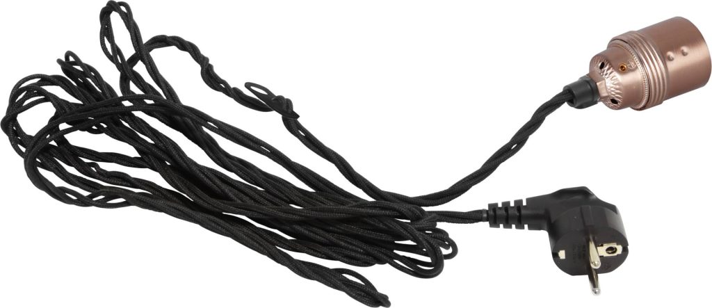 Johtosarja mustalla tekstiilijohdolla, kuparin värinen lampunpidike. Johto on 3,5 metriä pitkä. Yhdistä johtoon kivannäköinen valonlähde.