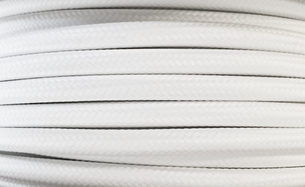 Valkoinen kangasjohto, joka sopii esim. valaisimien asennukseen.