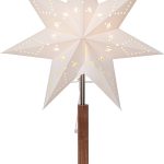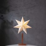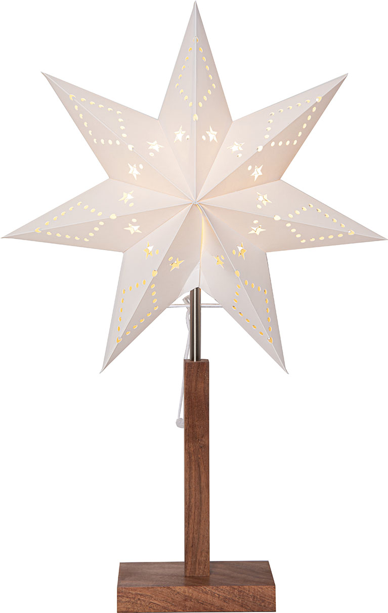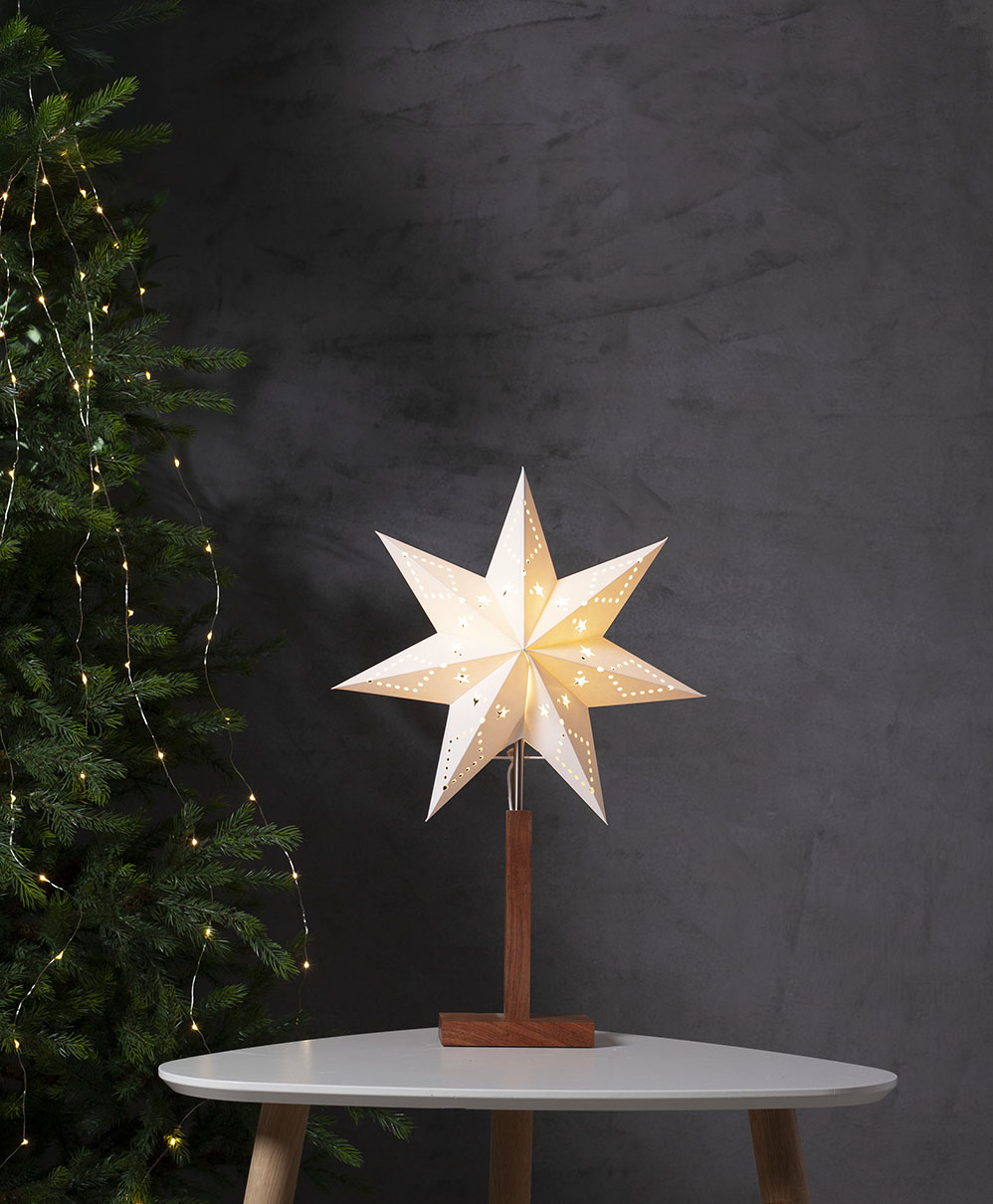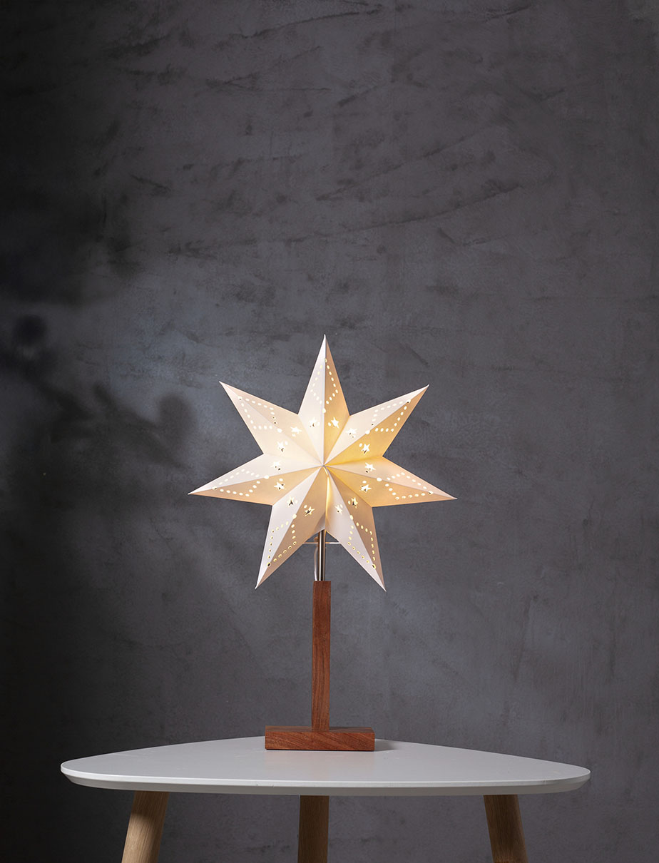 Ihastuttava pöytätähti akaasiapuisella jalustalla ja valkoisella kuvioidulla paperitähdellä. Sopii esimerkiksi ikkunalaudalle tai lipaston päälle tuomaan kotiin ihanaa joulutunnelmaa.