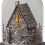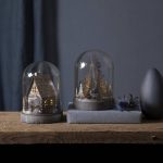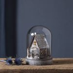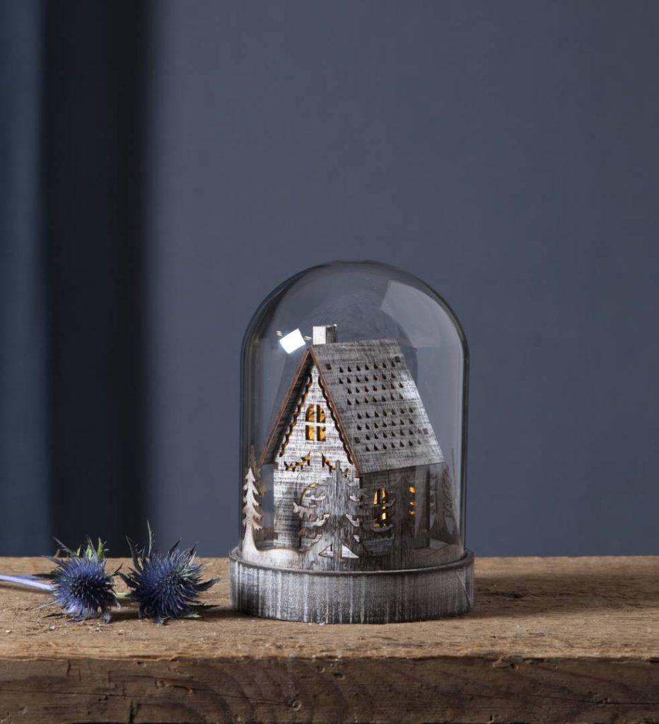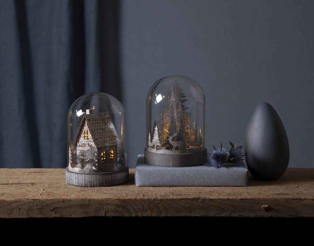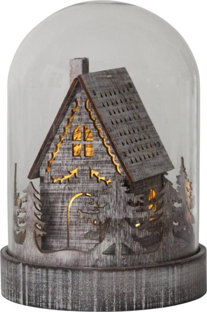 Pöytäkoriste puuta ja lasia. Valon sävy: lämmin valkoinen.