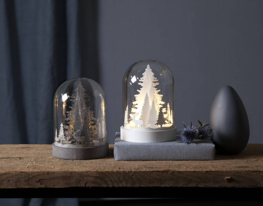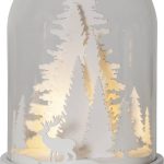 Kaunis pöytäkoriste, jossa lasikupolin sisällä metsämaisema lämpimän valkoisilla LED-valoilla. Lyhty luo kodikasta tunnelmaa pimeään vuodenaikaan.