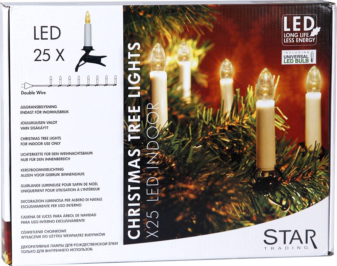 25-osainen kuusenkynttiläsarja, joka sopii sisäkäyttöön. Vaihdettavissa LED-lampuissa on lämpimän valkoinen kirkas valo. Koristele kuusesi näillä kynttilöillä saadaksesi kotiisi ihanan joulutunnelman.