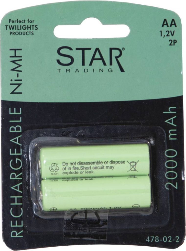 2 kpl ladattavia AA-paristoja, jotka sopivat 1,2V Ni-MH AA-paristoilla toimiviin aurinkokennovalaisimiin.