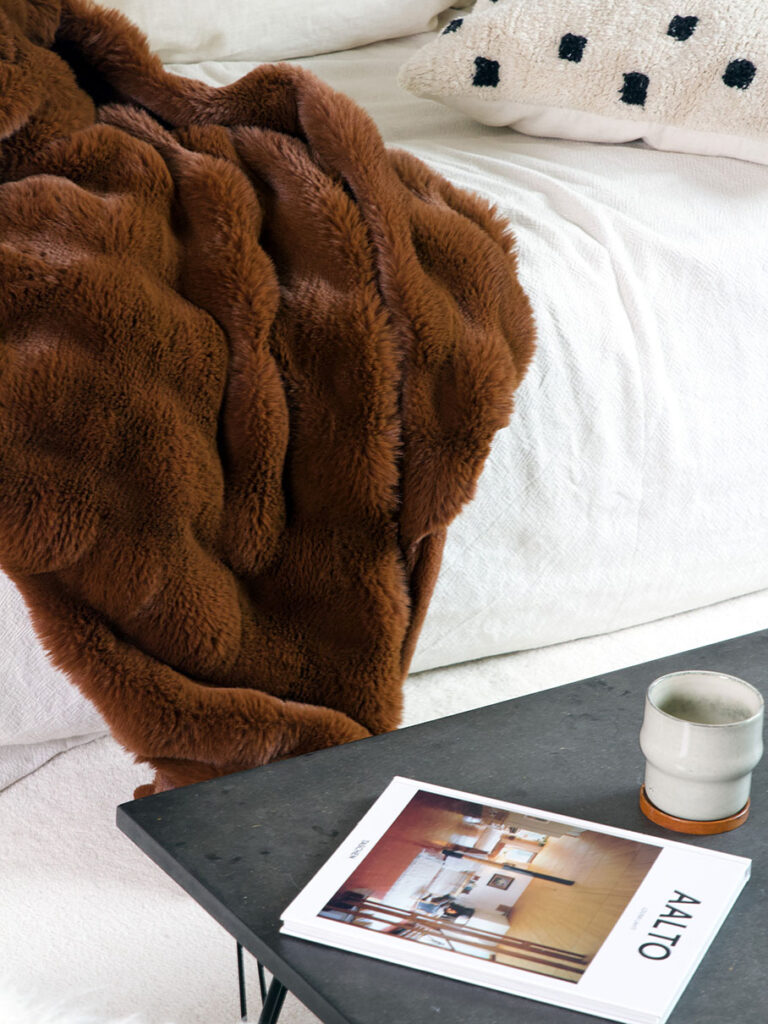 Torkkupeitto, jonka etupuoli keinoturkista ja taustapuoli pehmeää kangasta.