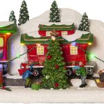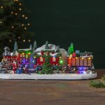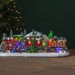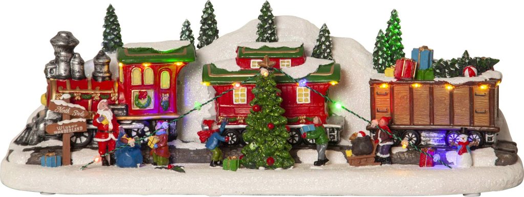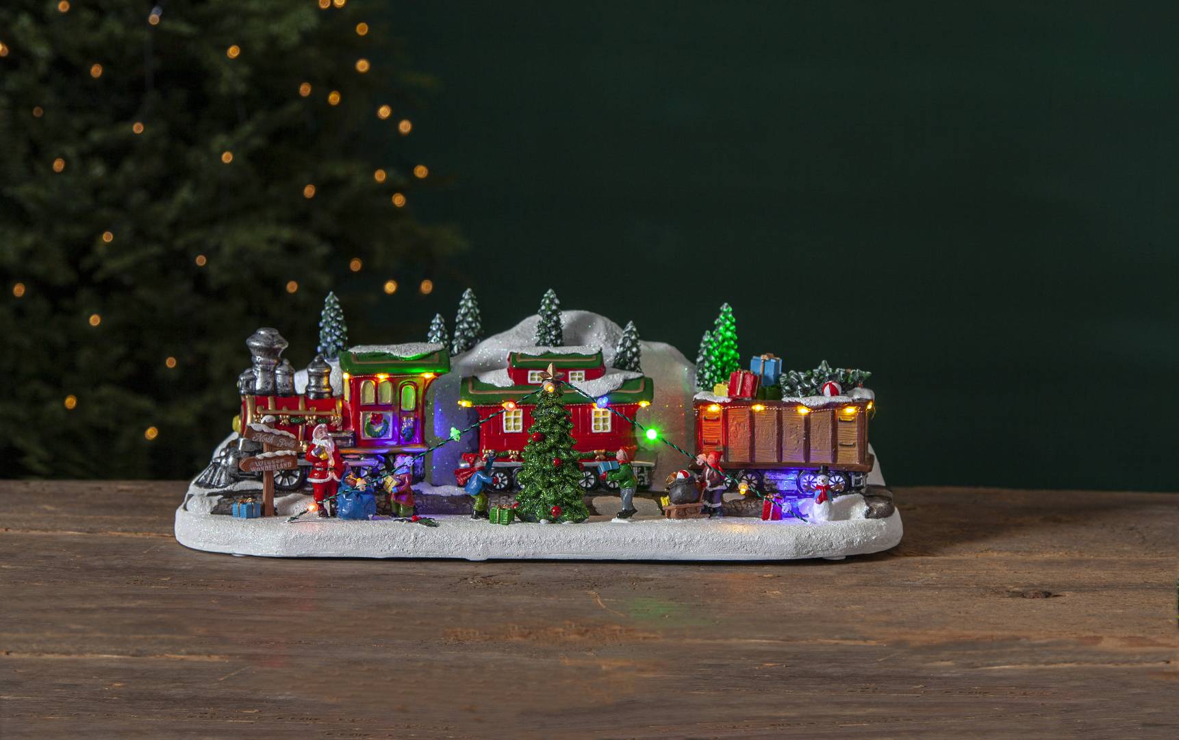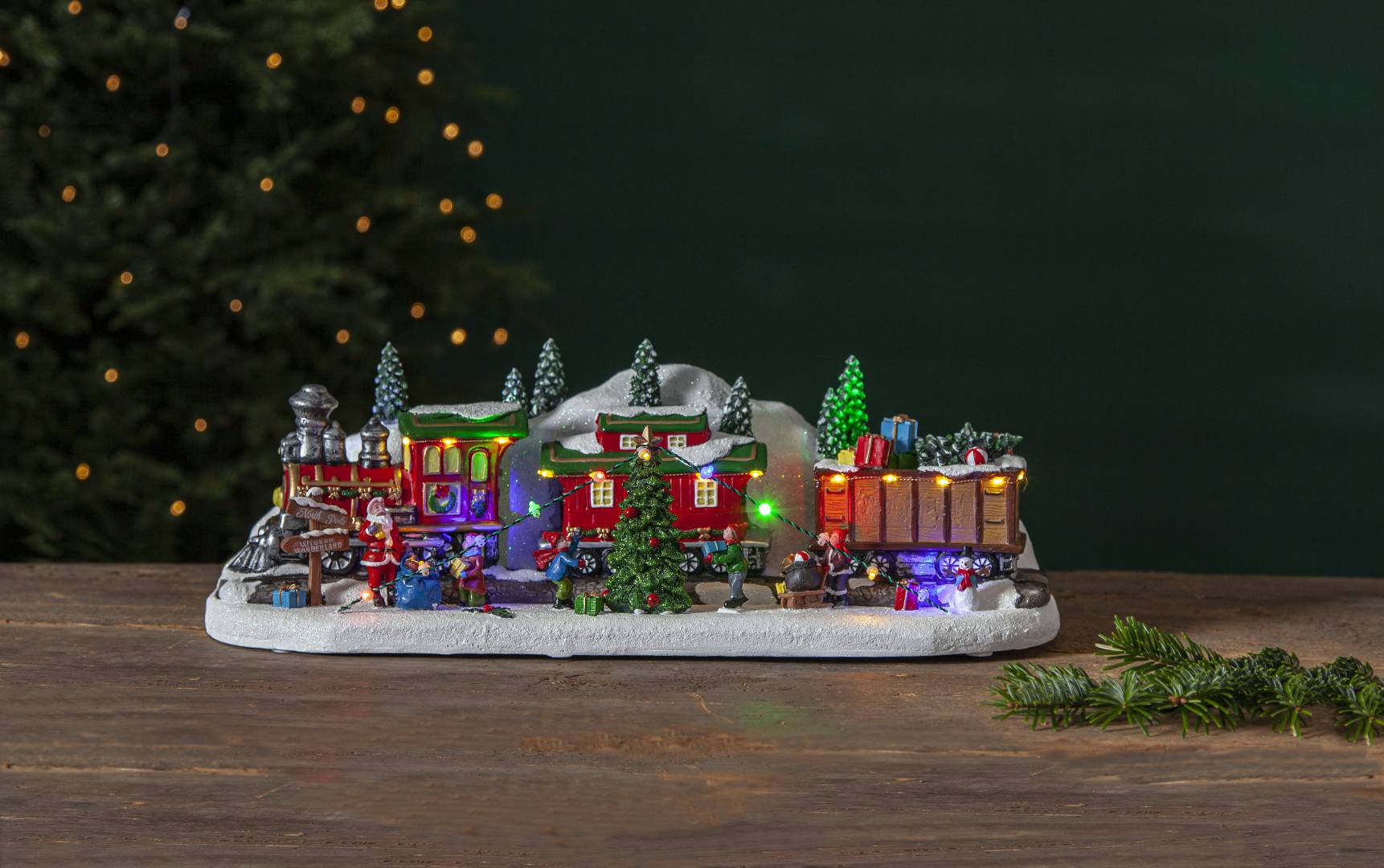Jouluinen pöytäkoriste, jossa on runsaasti yksityiskohtia. Junaa valaisee 29 moniväristä ja