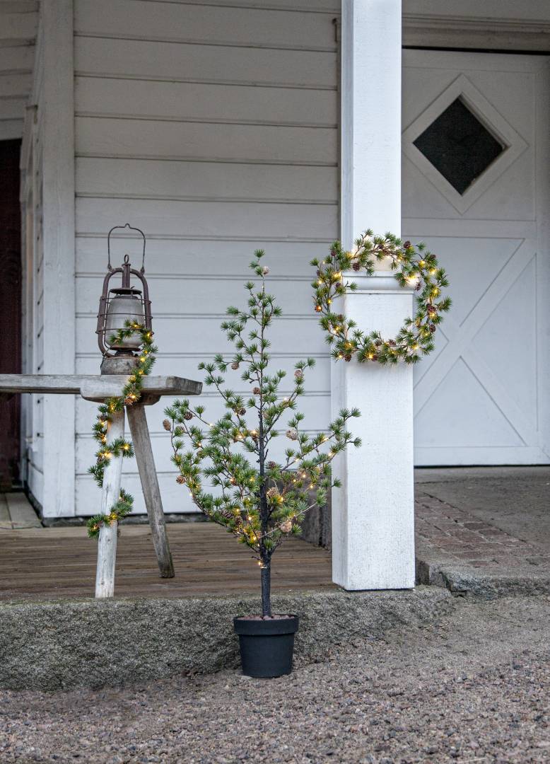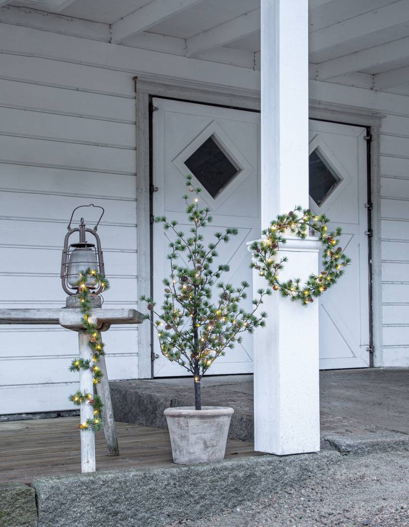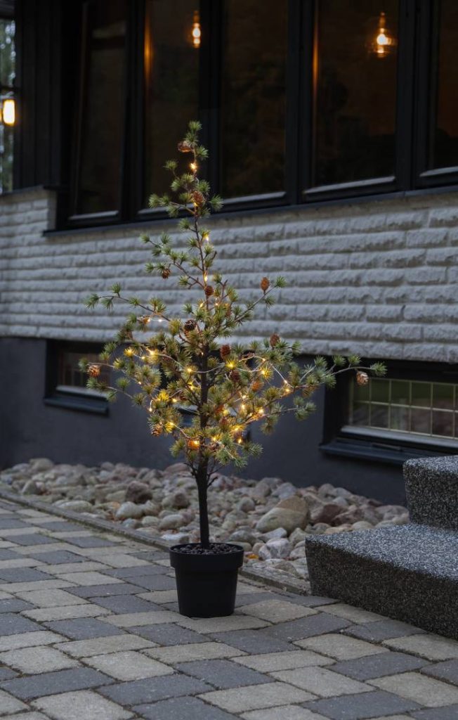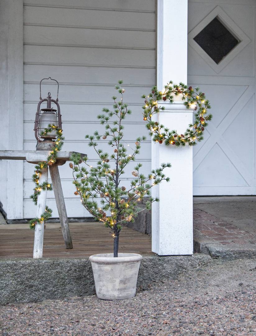 Puussa on koristeena käpyjä ja 40-osainen LED-valosarja lämpimän valkoisilla valoilla.