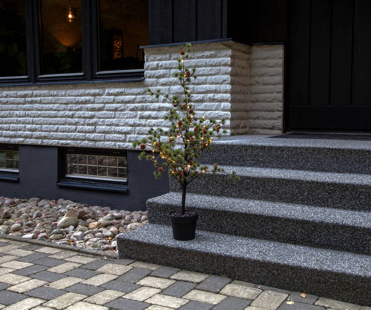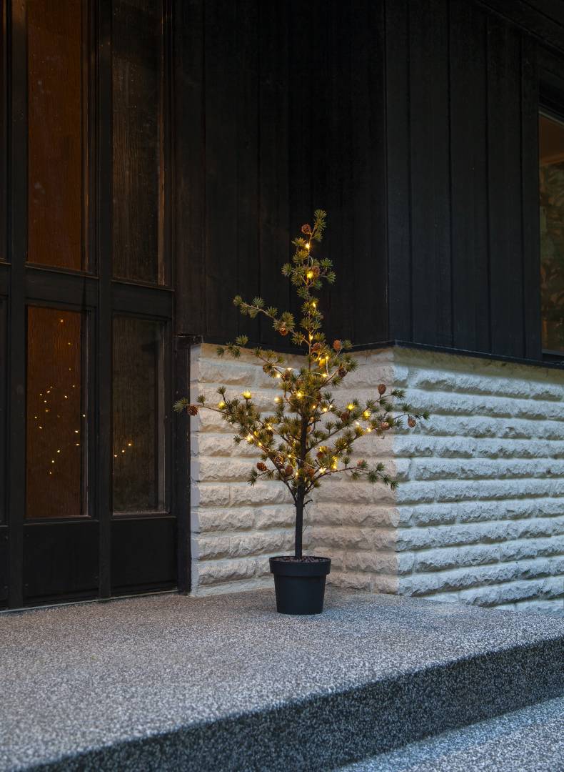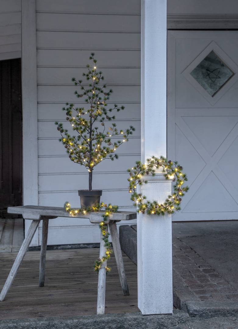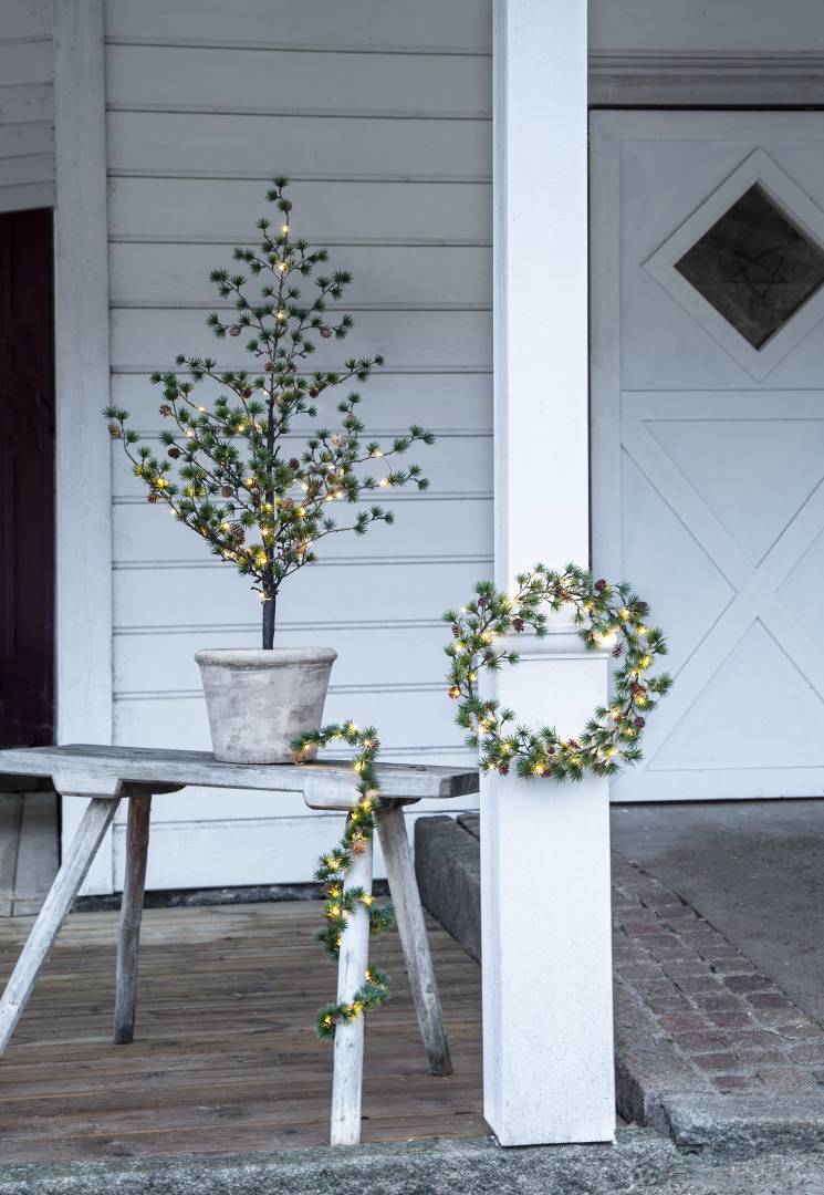 Puussa on koristeena käpyjä ja 40-osainen LED-valosarja lämpimän valkoisilla valoilla.