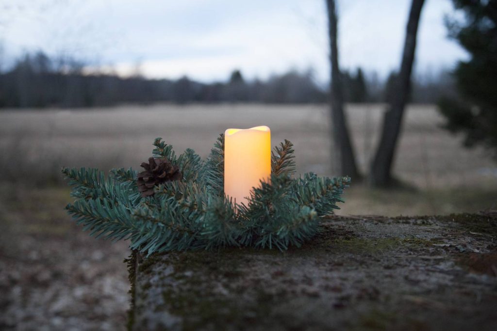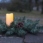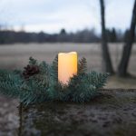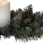 Paristoilla toimiva kynttilä havukoristeella. Kynttilässä loistaa lämmin kellertävä LED-liekki.