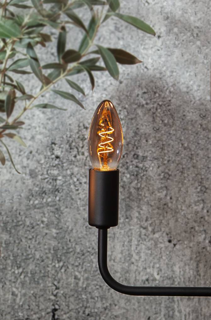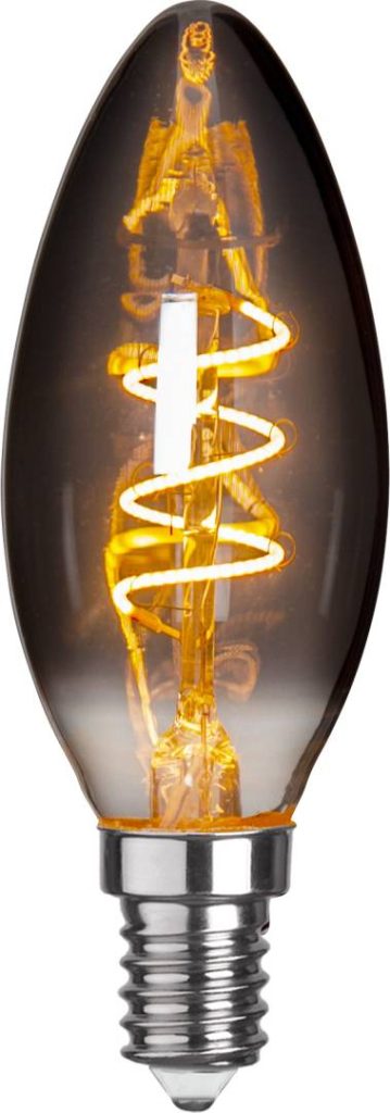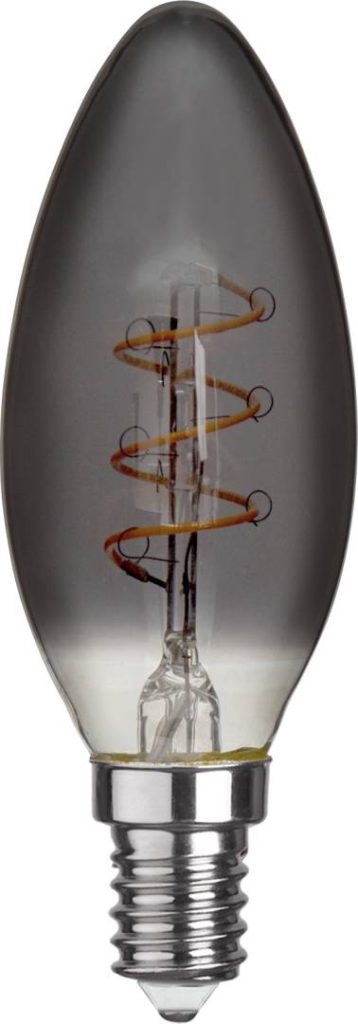 Koristeellinen LED-kynttilälamppu savunharmaalla lasilla ja ohuella 0,8 mm LED-filamentilla.