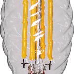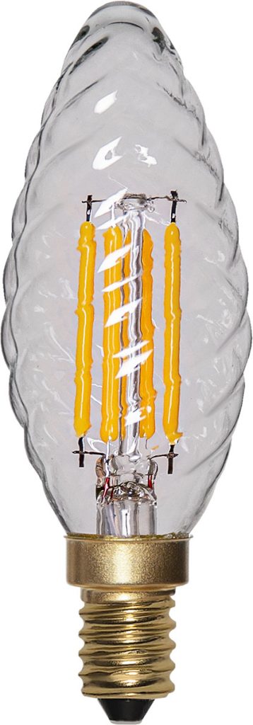 Himmennettävä LED-kierrekynttilälamppu kirkkaalla lasilla ja lämpimällä, pehmeällä valolla. E14-kanta, värilämpötila 2100K. Valovirta 470 lumenia.