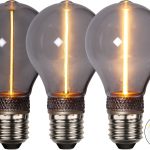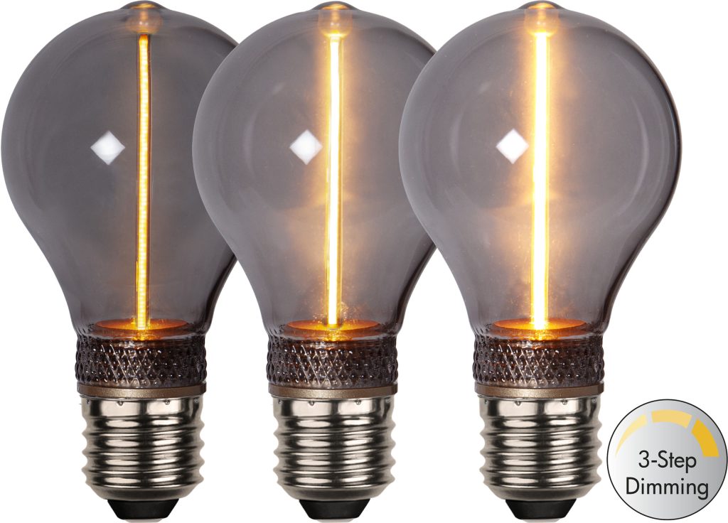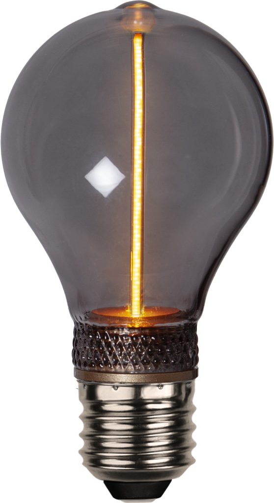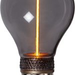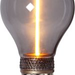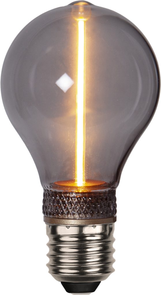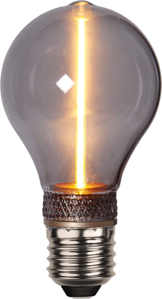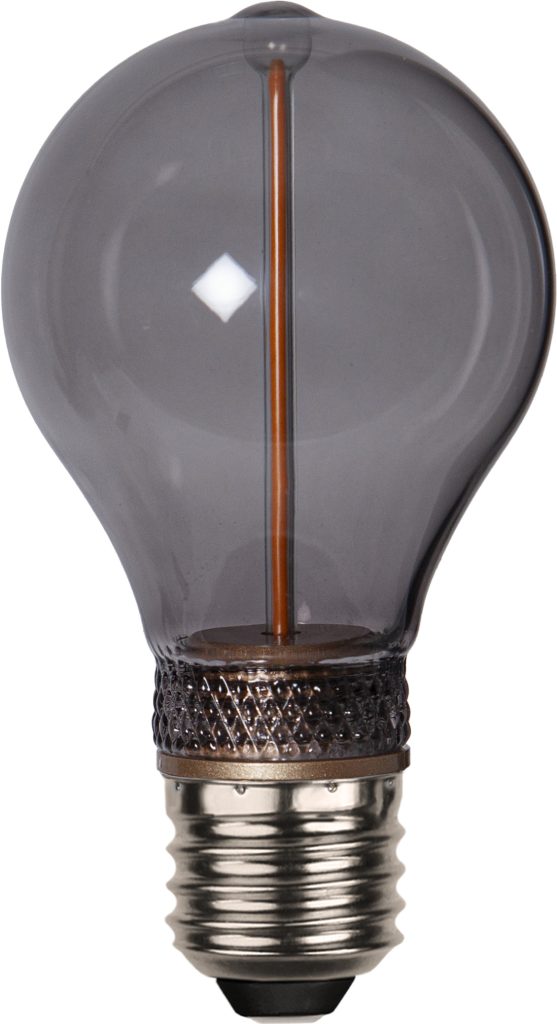 Koristeellinen savunharmaa E27 LED-lamppu, jossa on lasikuvun keskellä pitkä filamenttisauva. Lampussa on katkaisijalla toimiva 3-vaiheinen himmennys (100-50-20lm). Värilämpötila 1800K.