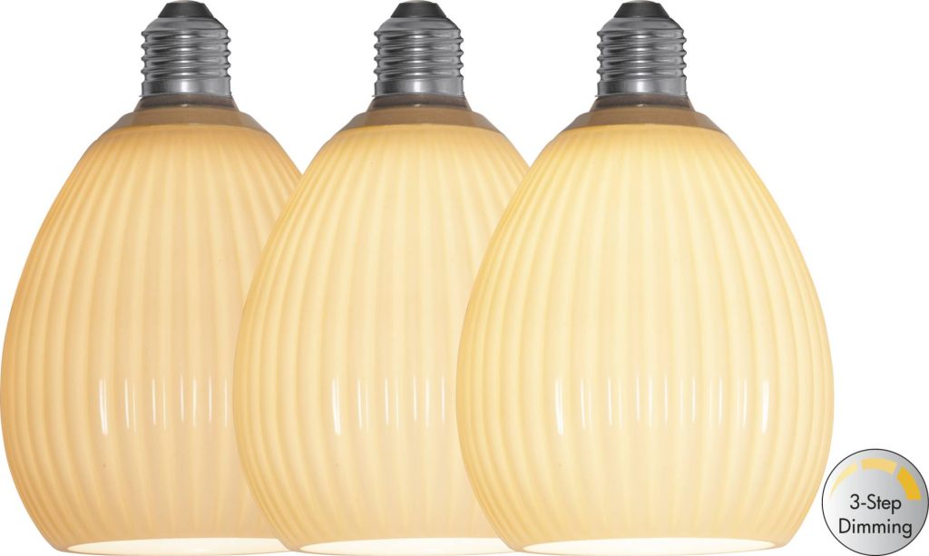 Beige lasivarjostin ja LED-lamppu yhdessä! Lampussa on tavallisella katkaisijalla toimiva kolmivaiheinen himmennys 31-100-210 lm. Lamppu syttyy aina ensin pienimmällä valoteholla.