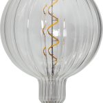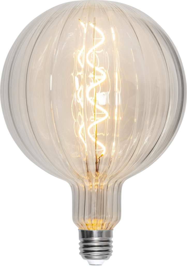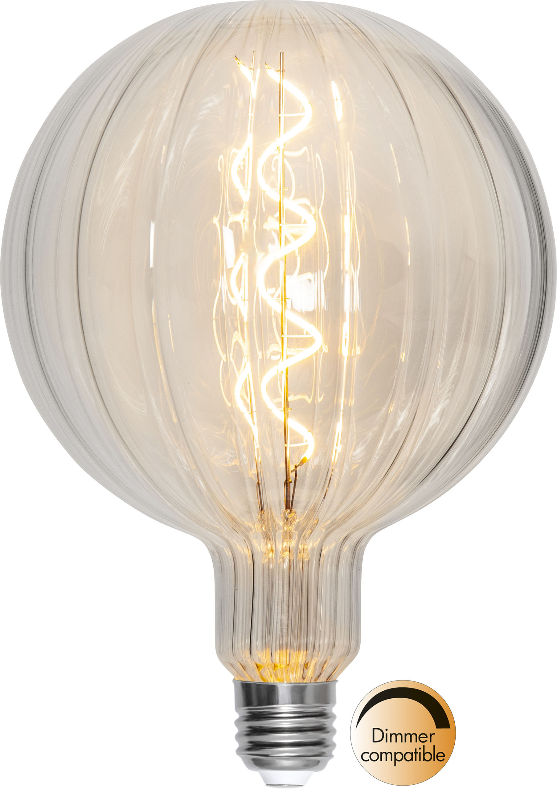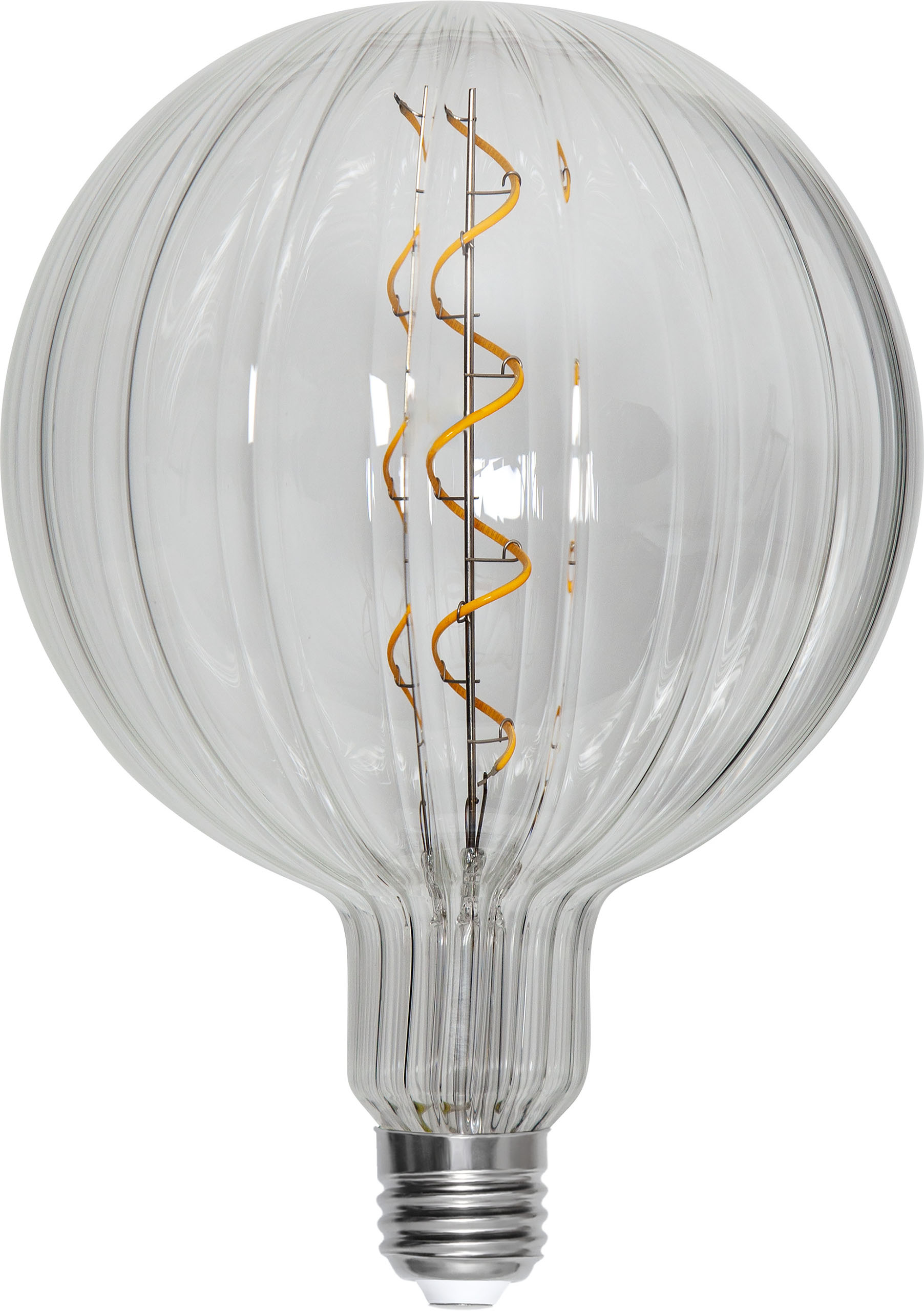 Koristeellinen LED-lamppu kirkkaalla lasilla. Lampussa on tunnelmallinen, lämmin valo ja se sopii esimerkiksi ripustettavaan johtosarjaan tai pöytävalaisimiin, esimerkiksi olohuonetta tai ruokailuhuonetta valaisemaan.