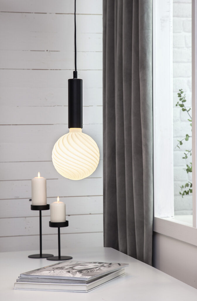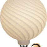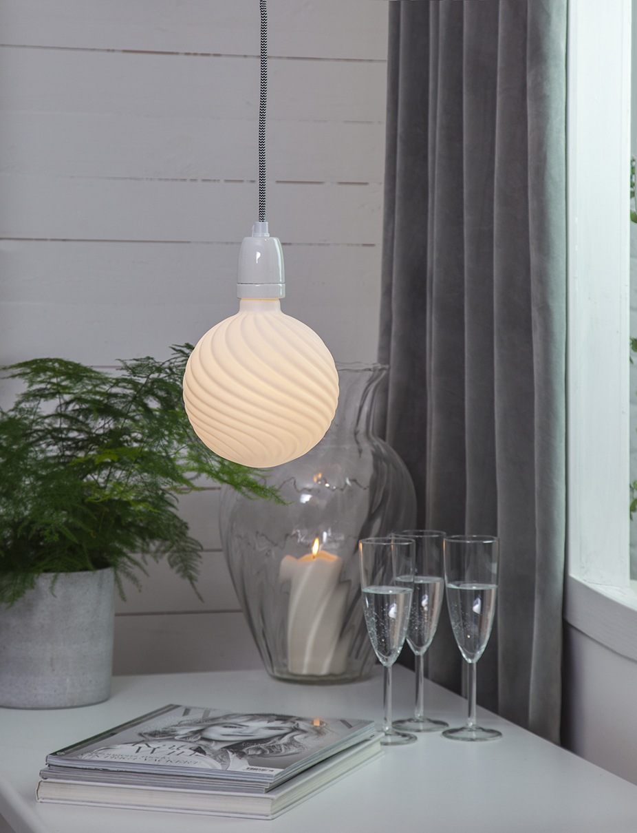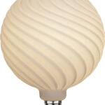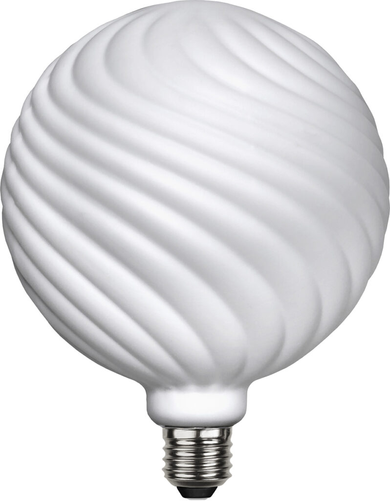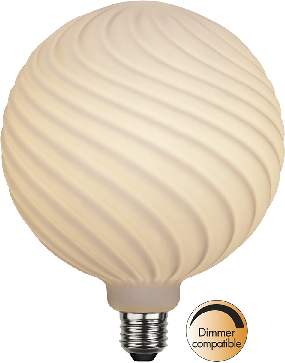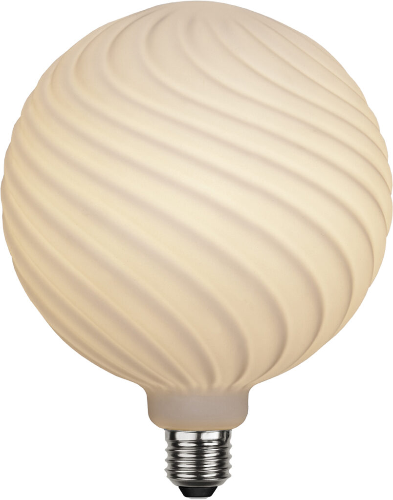 Opaalivalkoinen LED-lamppu, jossa pinnassa kauniit uurteet. Luo kauniin valaistuksen. Lamppu on himmennettävä.