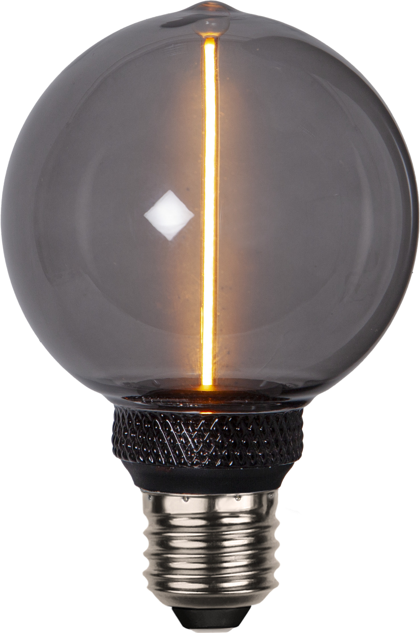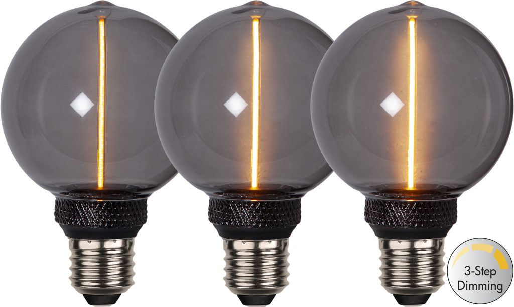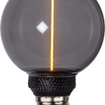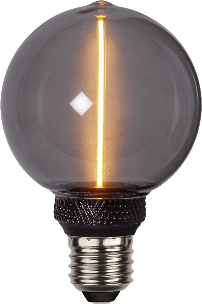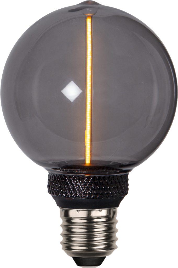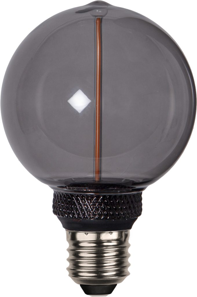 Koristeellinen savunharmaa E27 LED-lamppu, jossa on lasikuvun keskellä pitkä filamenttisauva. Lampussa on katkaisijalla toimiva 3-vaiheinen himmennys (100-50-20lm). Värilämpötila 1800K.