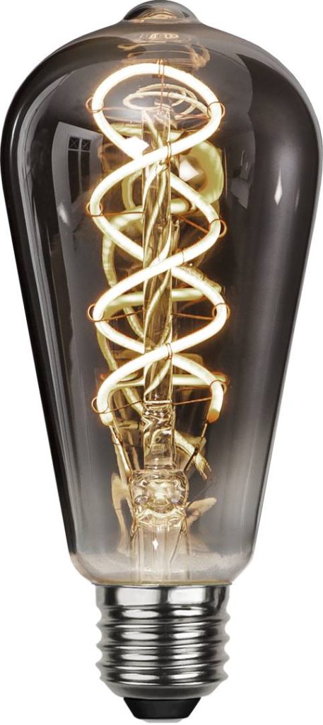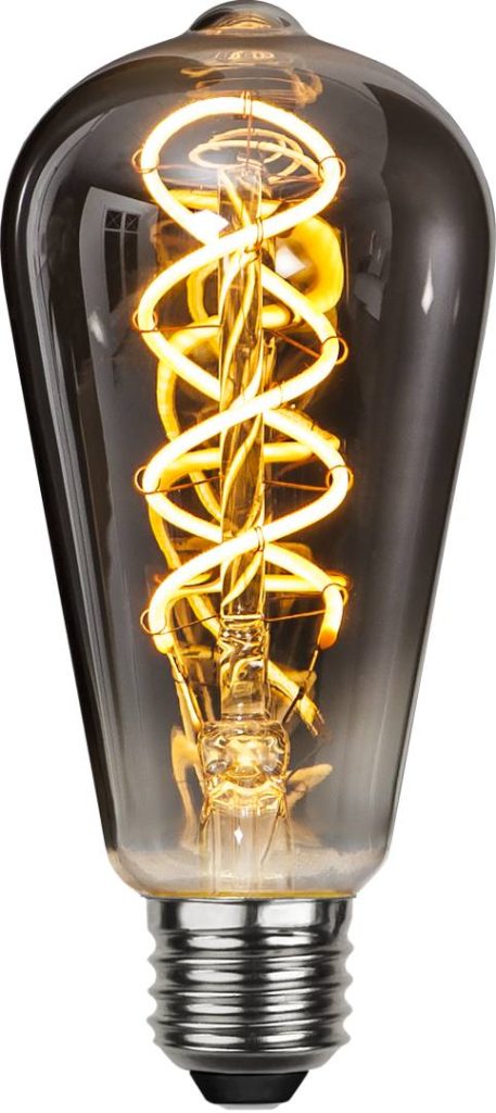 LED-lamppu spiraalifilamentilla ja savunharmaalla lasilla, joka luo pehmeän ja lämpimän valaistuksen. Himmennettävä.
