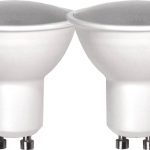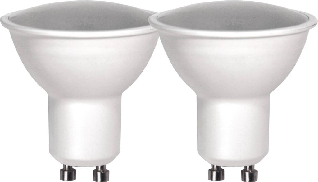 Muovirunkoinen LED-spottilamppu kahden kappaleen pakkauksessa.