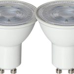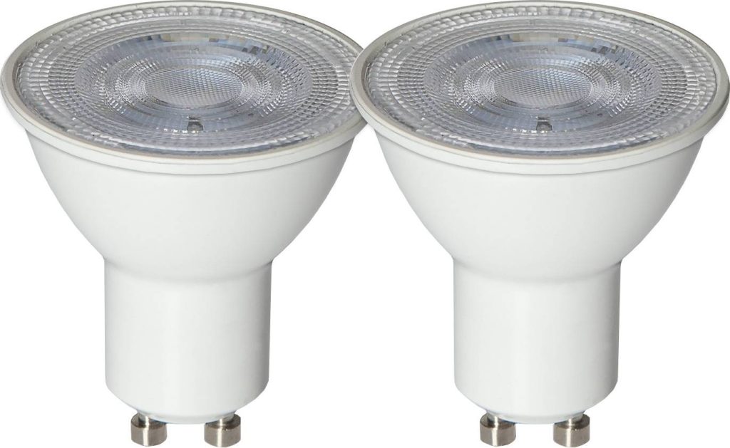 Muovirunkoinen LED-spottilamppu kahden kappaleen pakkauksessa.