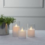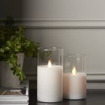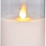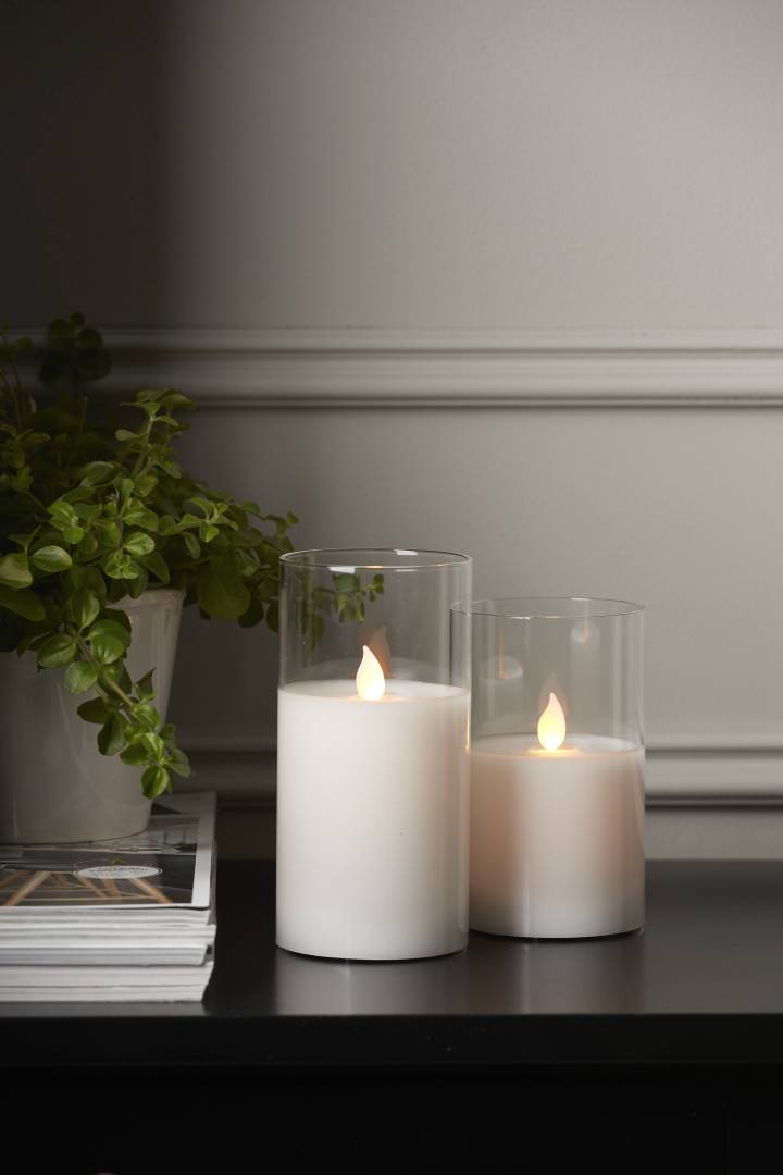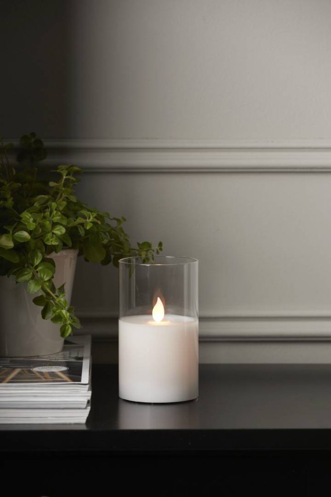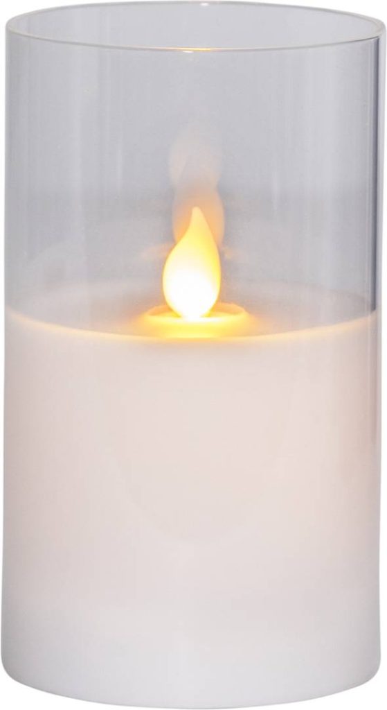 Lasilyhty, jonka sisässä vahakynttilä lämpimän keltaisella lepattavalla Twinkle-liekillä.