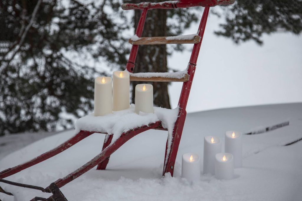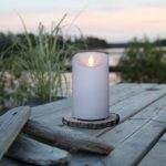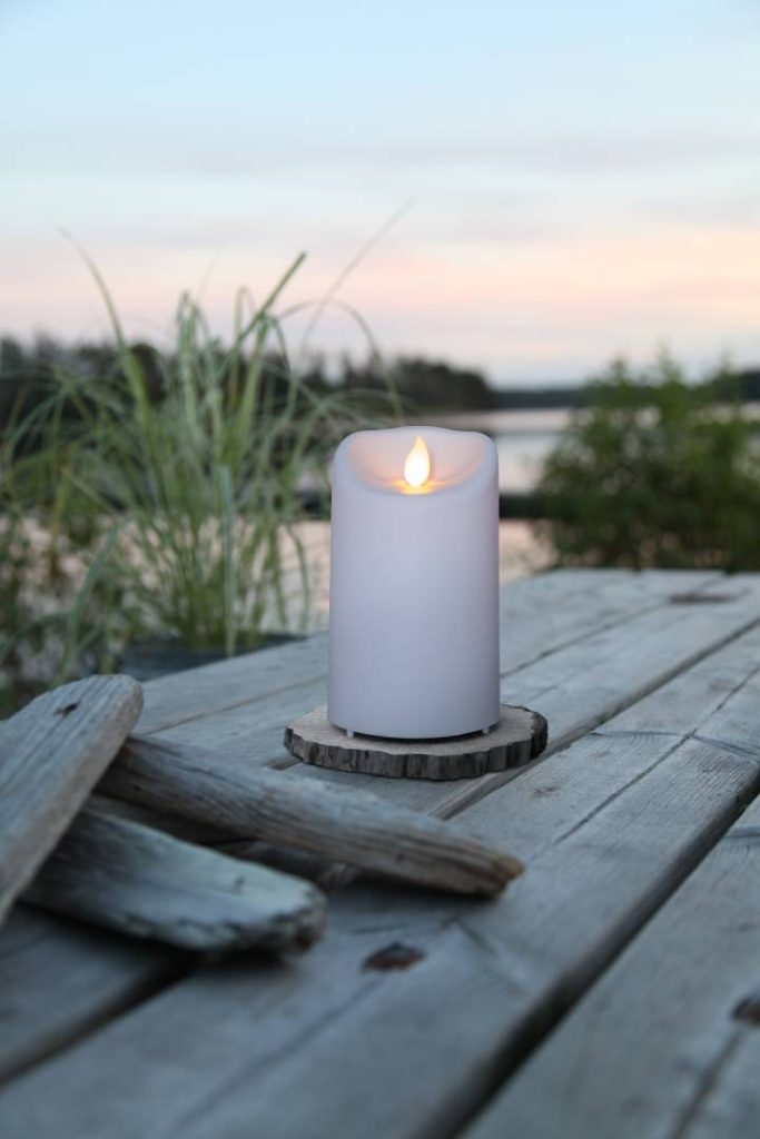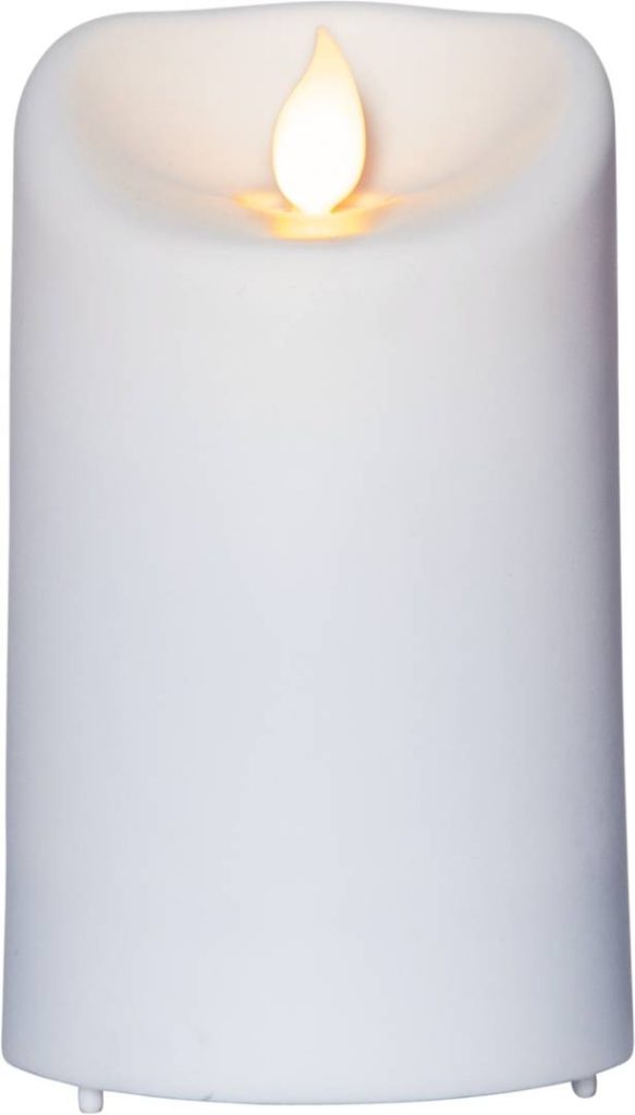 Ulko- ja sisäkäyttöön sopiva muovista valmistettu LED-kynttilä, jossa on lämpimän keltainen lepattava Twinkle-liekki.
